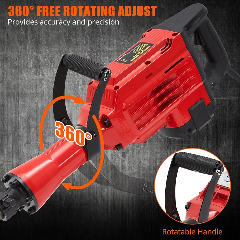 ERGONOMIC AND ADJUSTABLE: Featuring a 360° rotating handle, this demolition hammer reduces user fatigue during prolonged use. Its locking button allows for continuous operation, enhancing user comfort and task efficiency