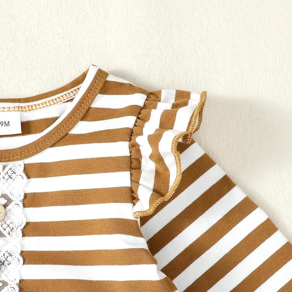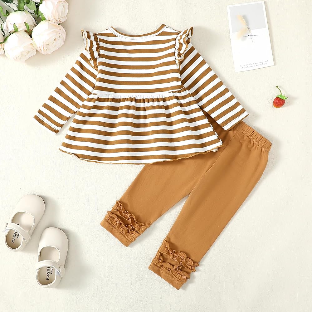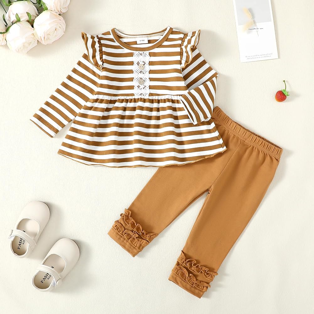 Cute Baby Girl Winter Clothes:Ruffle long sleeve shirt top in boho design-stripe/flower, pair with simple and solid color pants, cute and elegant