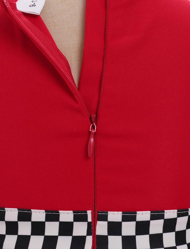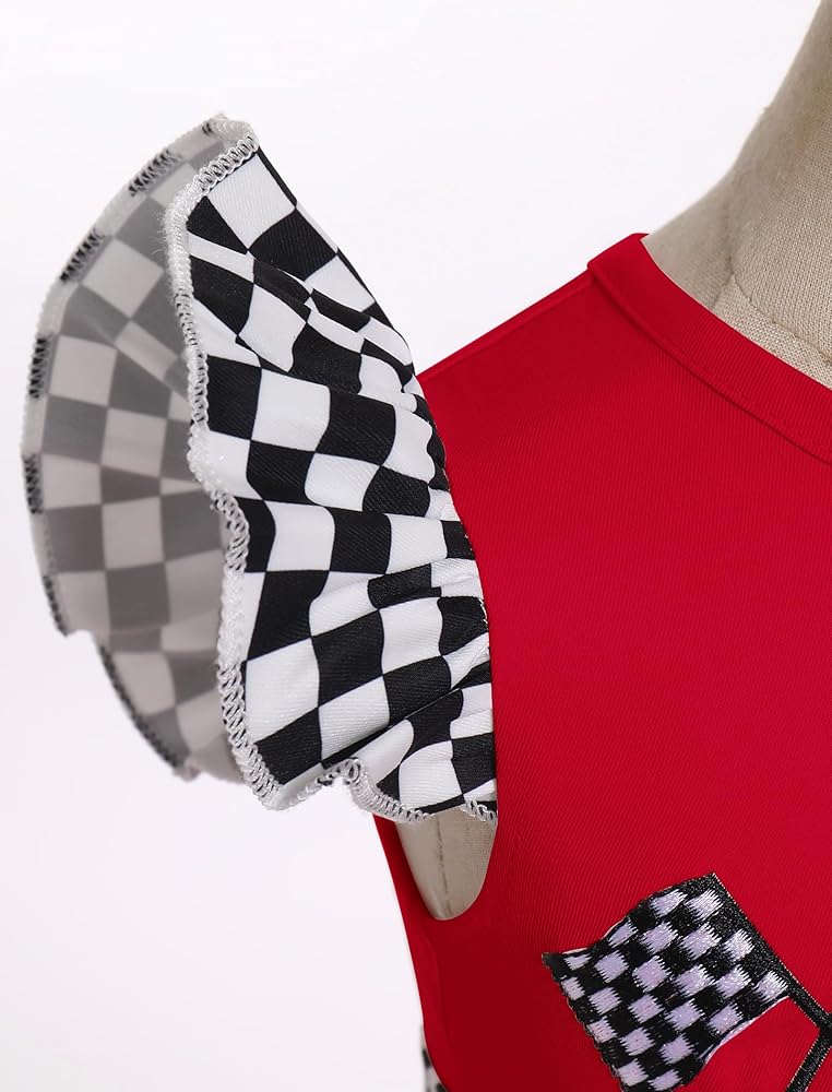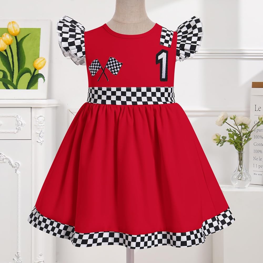 BABY RACE CAR DRIVER DRESS: Flutter sleeve round neck ruffle dress. Embroidered checkered racing flag accents at the left, the number "1" or "2" at front, black and white checkered detail at waistline and hemline, adds a striking touch to the racing costume. Hidden zipper at back, zip garage between the zipper and the body, prevent chafing and reduce discomfort caused by the frigid zip. Fluffy ruffle skirt with checkered binding, looks graceful and fashionable by every move