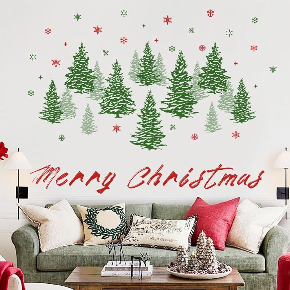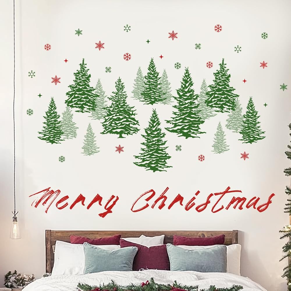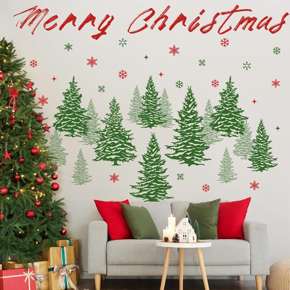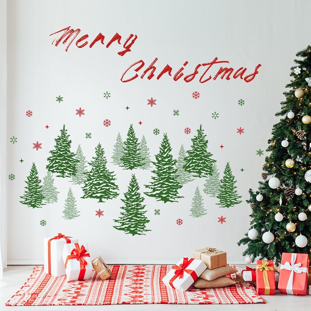 Watercolor Pine Tree Wall Decals Winter Snowflake Woodland Wall Stickers Merry Christmas Wall Decal DIY Peel and Stick Removable Xmas Green Tree Wall Stickers for Kids Nursery Decor