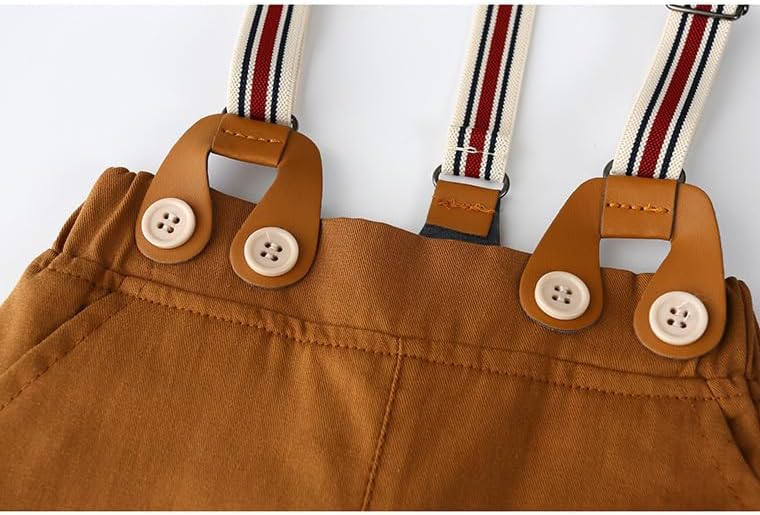 Our baby boy suits comprise 4 parts: 1 long-sleeve shirt, 1 pair of pants, 1 detachable bow tie, and 1 detachable back strap,a Beret.Versatile for any occasion, crafted from high-quality fabric, making it the perfect choice for baby boy formal clothes.