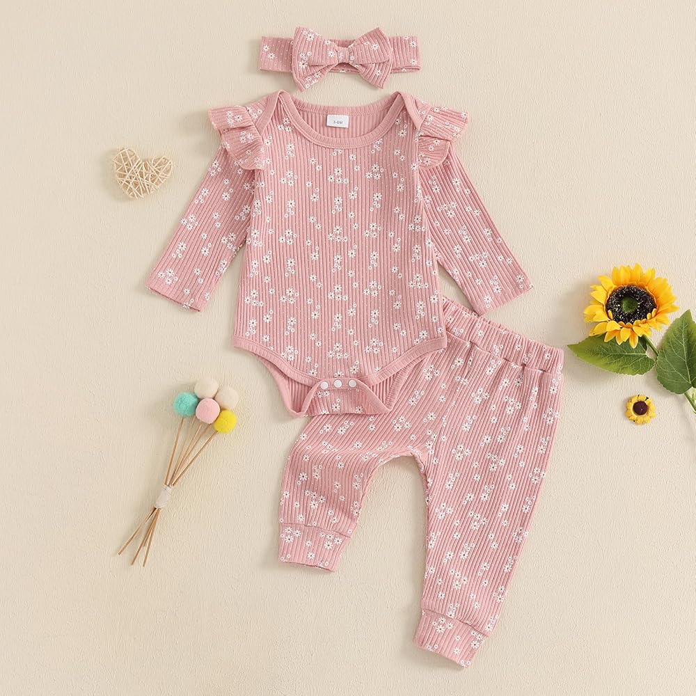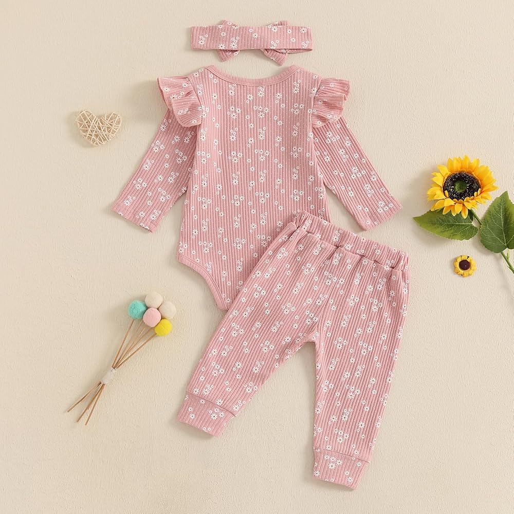 FASHIOBLE DESIGN: Girls fashion outfit with floral print. Baby girl romper, ribbed fabric, round neck, ruffles, long sleeves. Baby girl pants, elastic waist design, and cute headband set, make your little one cute and charming