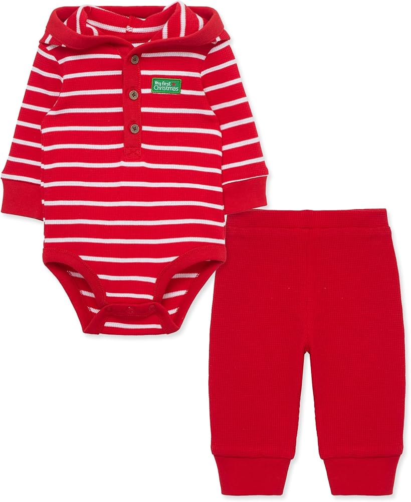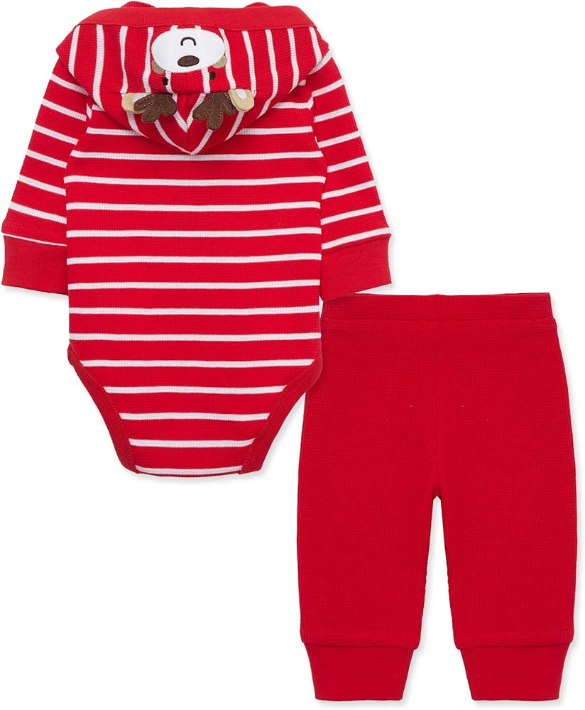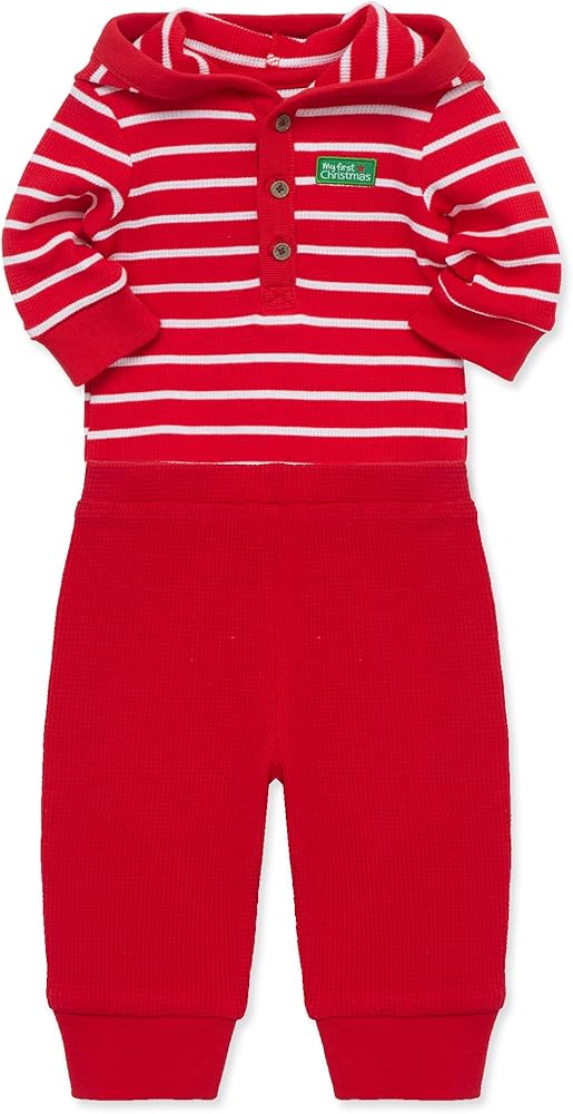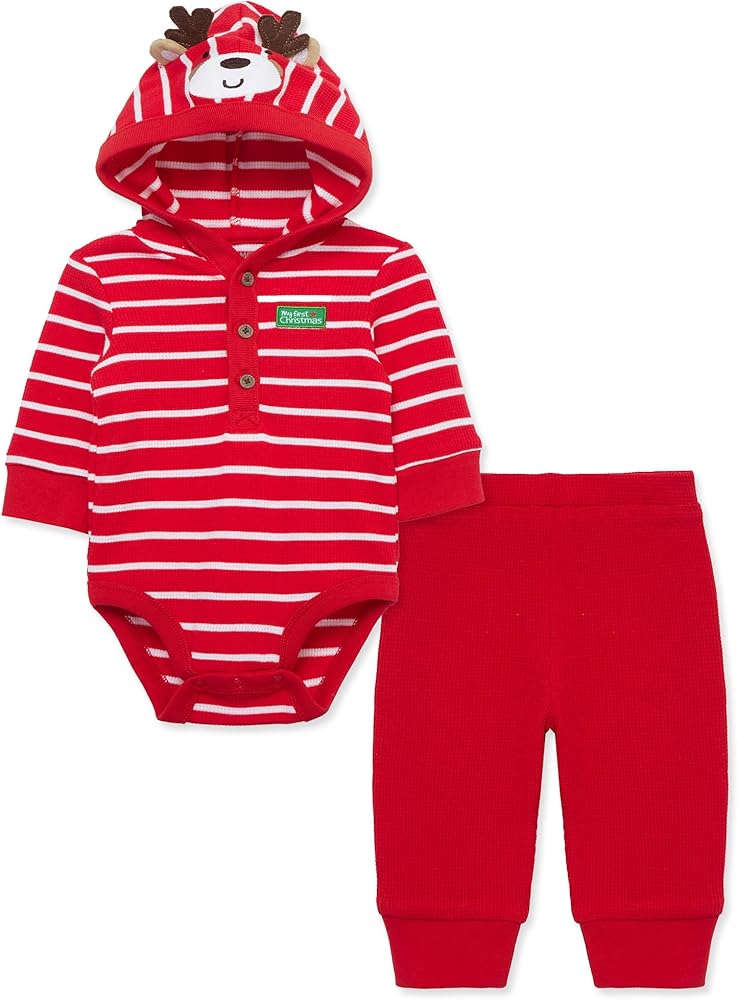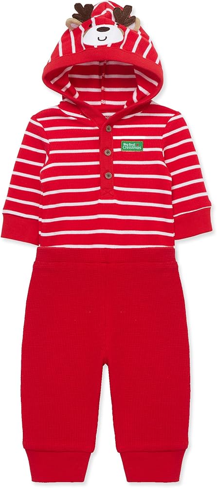 A cozy and festive outfit to celebrate the holiday season in. Featuring stripes, a waffle knit, and reindeer features on the hood of the bodysuit. Pair it with matching pants for a cozy outfit.