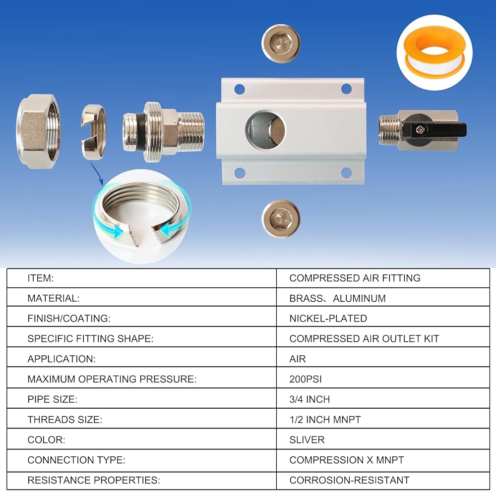 Size: 3/4'' Piping x 1/2'' Male NPT Threads air piping straight fitting fit 3/4 inch compressed air piping system, working pressure is 200 psi at 73℉ and 160 psi at 140℉