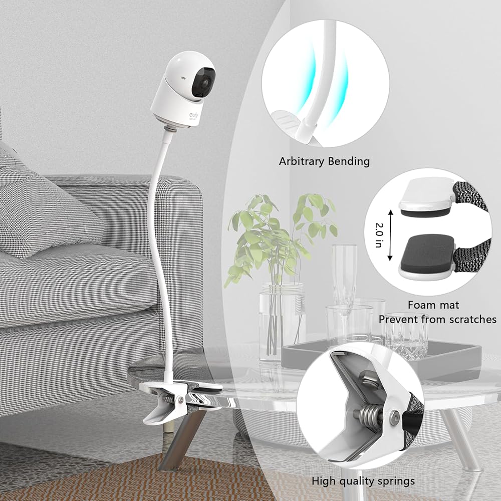 Acquire a top-of-the-line mount: Package includes 1 x 15.7inch movable camera clamp(1/4''-20 screw) and 1 x camera adapter for eufy Indoor Cam C210 and C220(Camera not included)