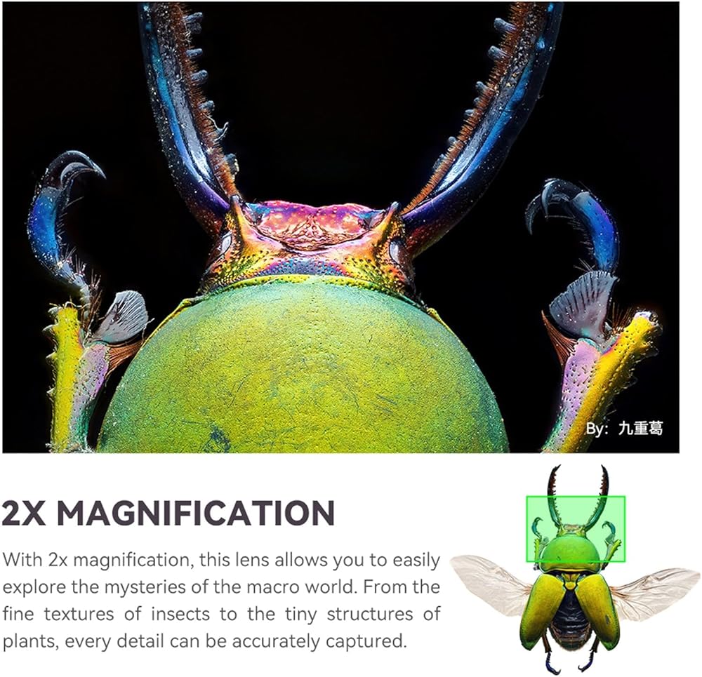 2X Magnification: With 2x magnification, this lens allows you to easily explore the mysteries of the macro world. From the fine textures of insects to the tiny structures of plants, every detail can be accurately