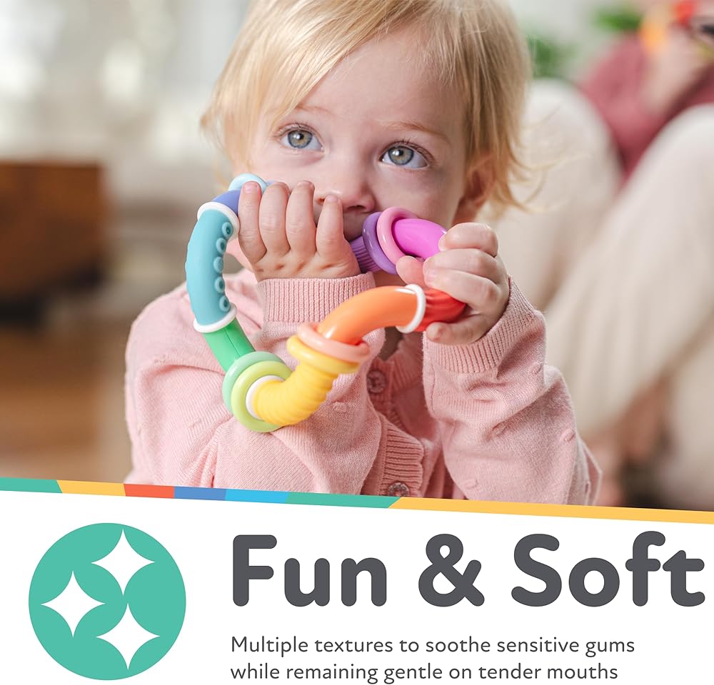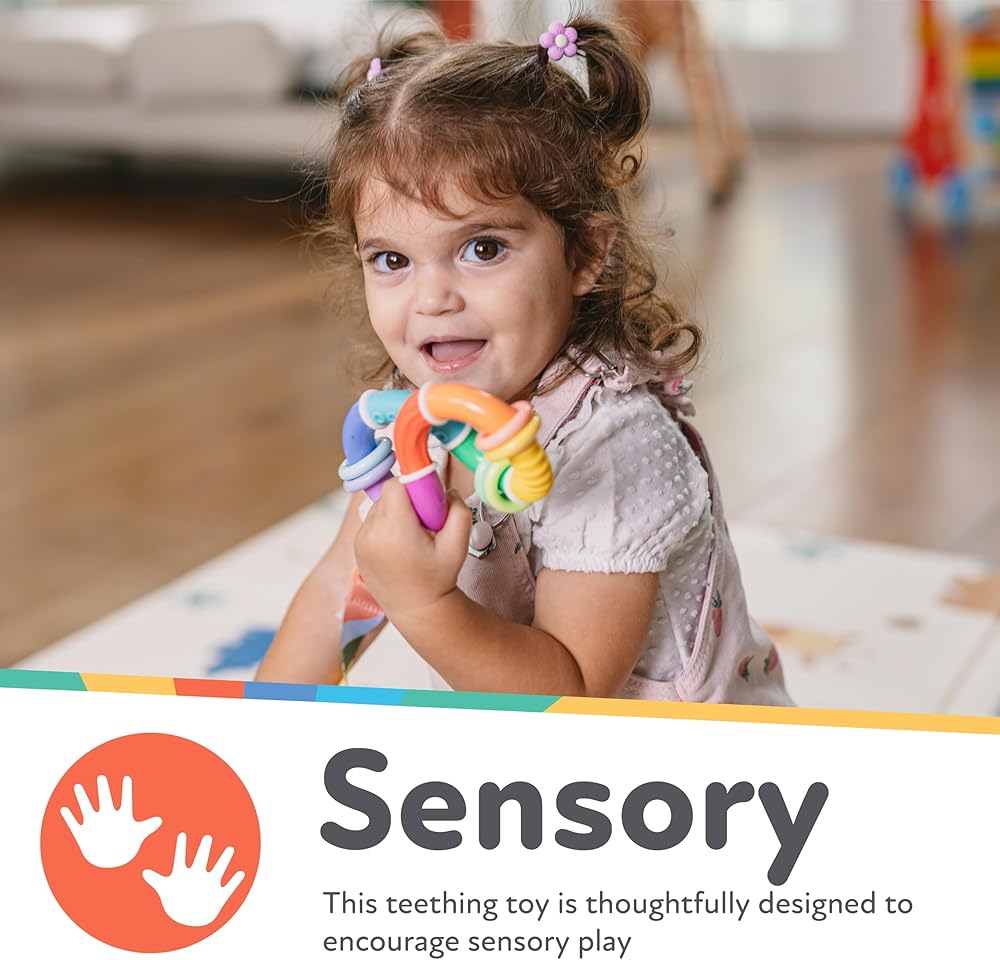DESIGNED FOR GRIPPING: The teether toy's design is easy for babies to grasp and hold, engaging their fine motor skills and fostering dexterity