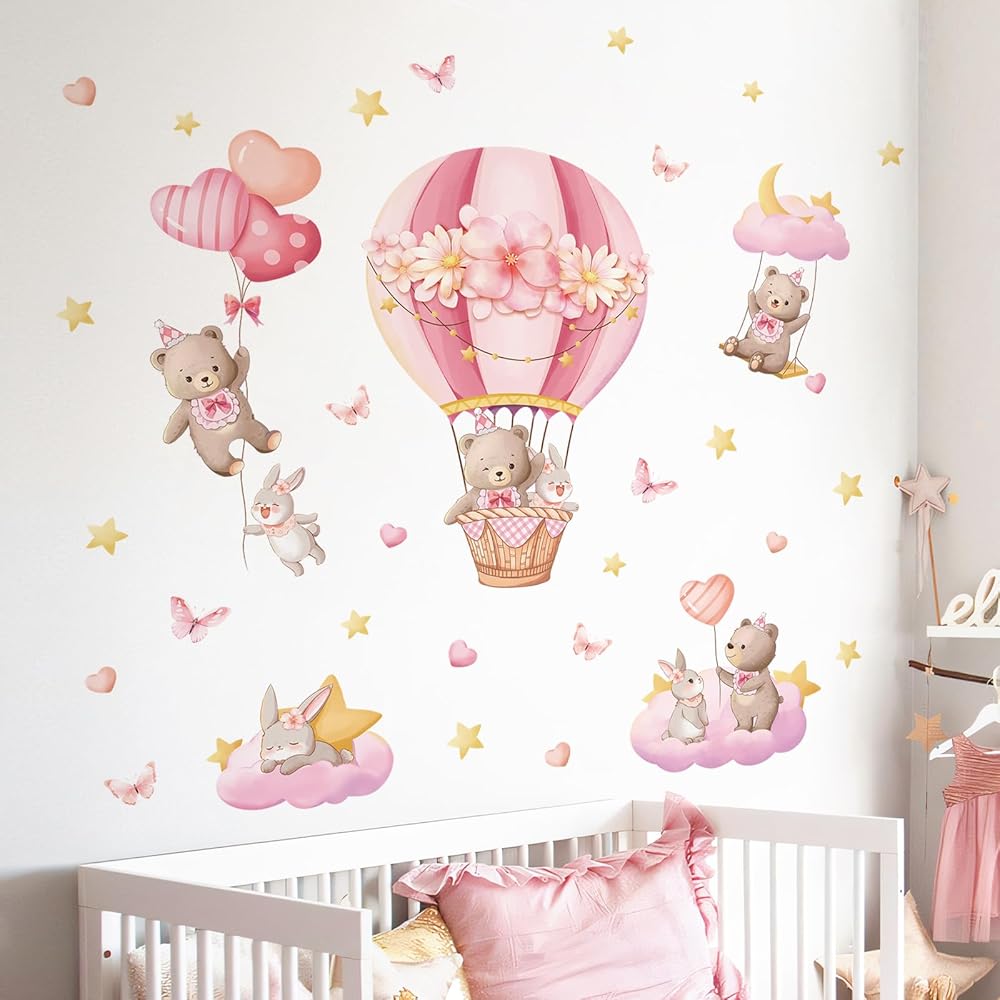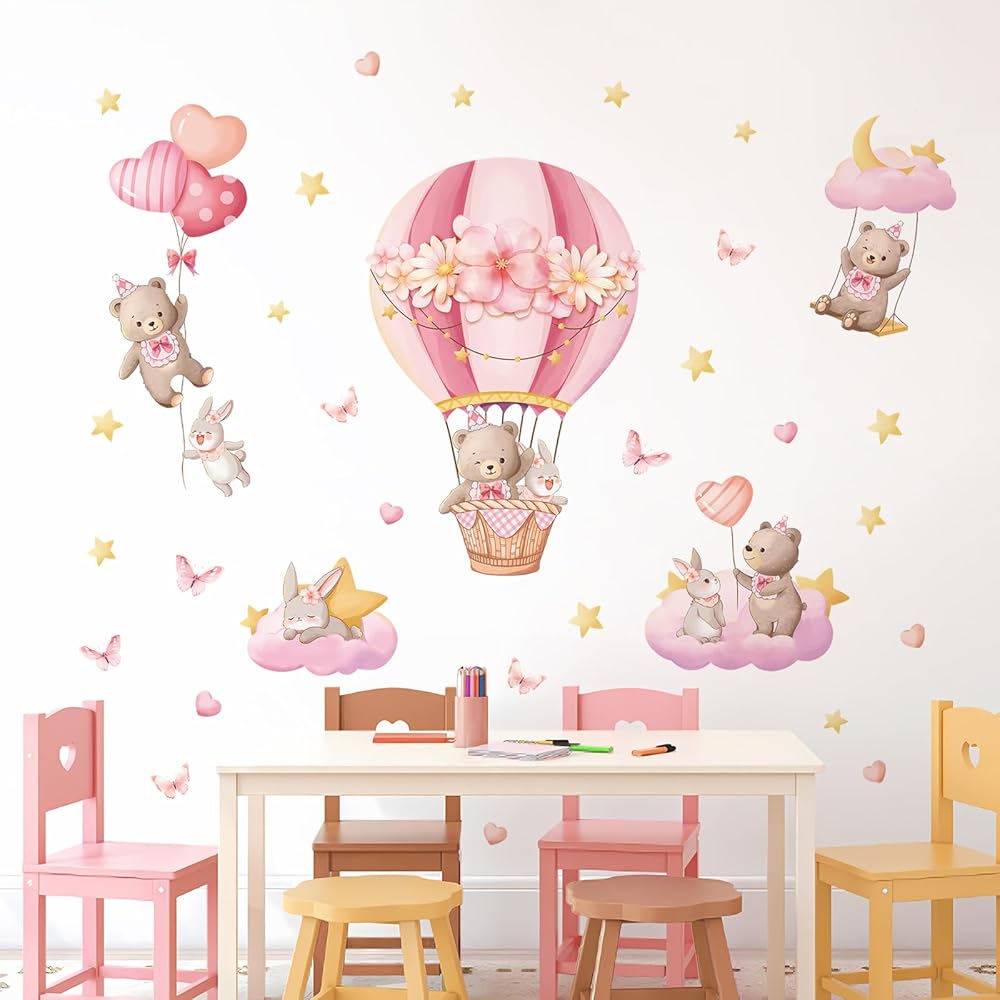Reliable and Durable: Our pink hot air balloon wall decals are made of vinyl, ink and adhesive, it's easy to peel and stick, removable and waterproof. The bear wall stickers are durable and can withstand daily wear and tear, as well as minor cleaning without losing their appearance.