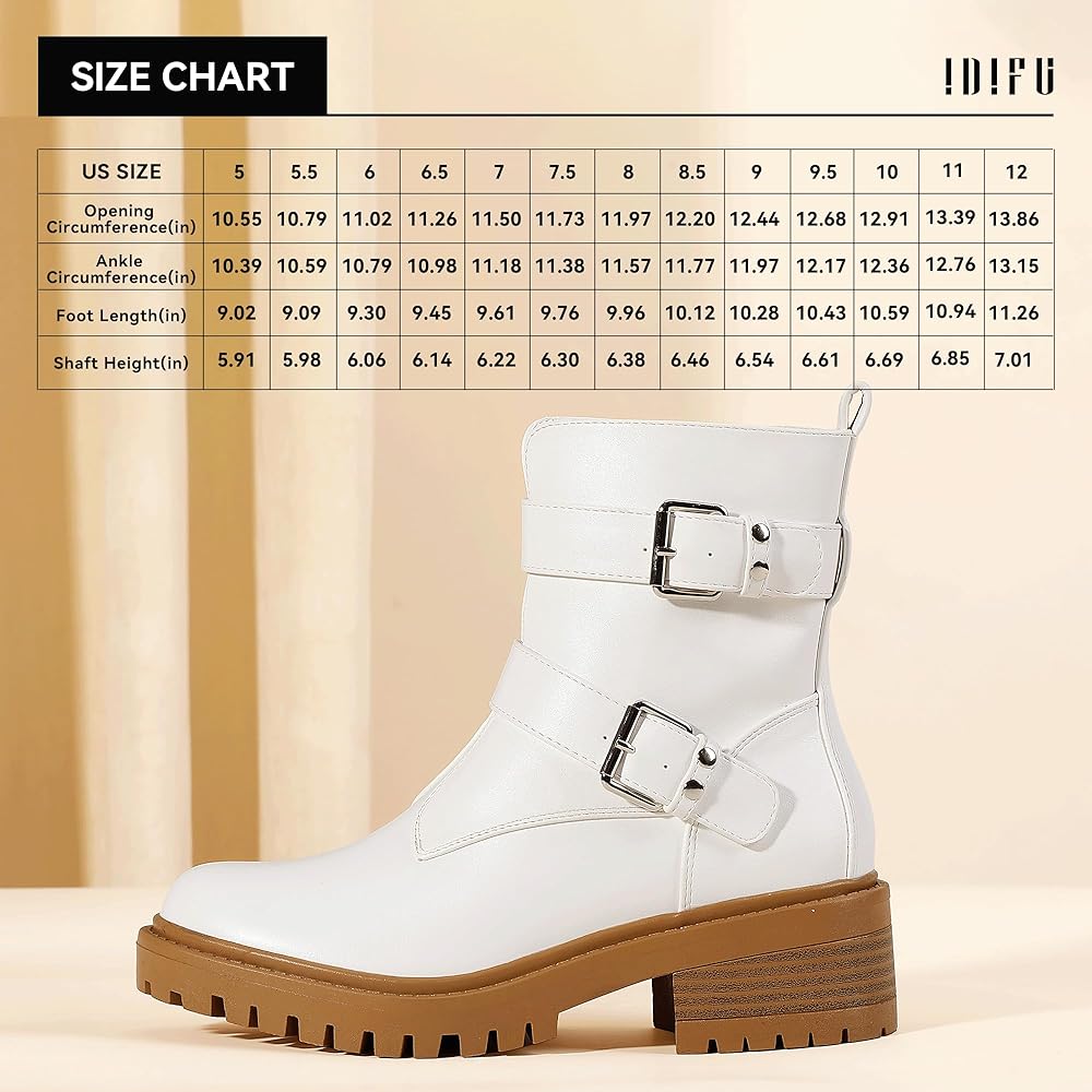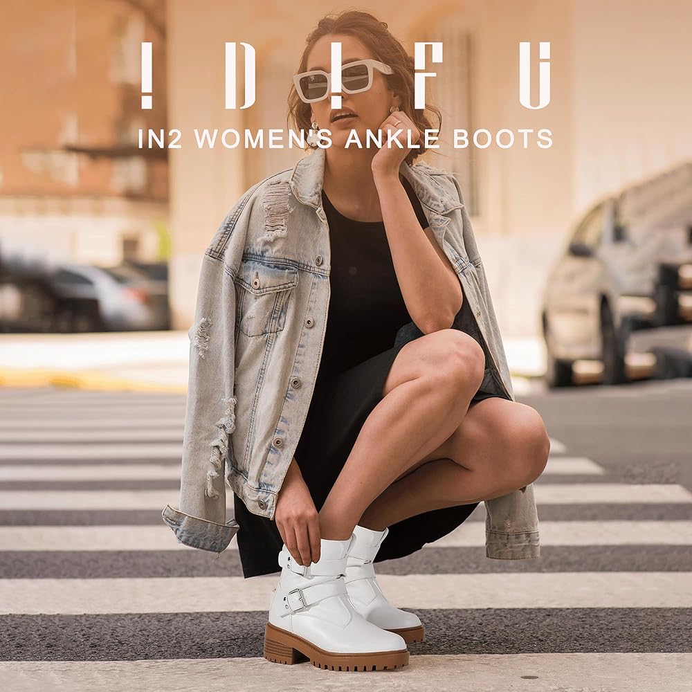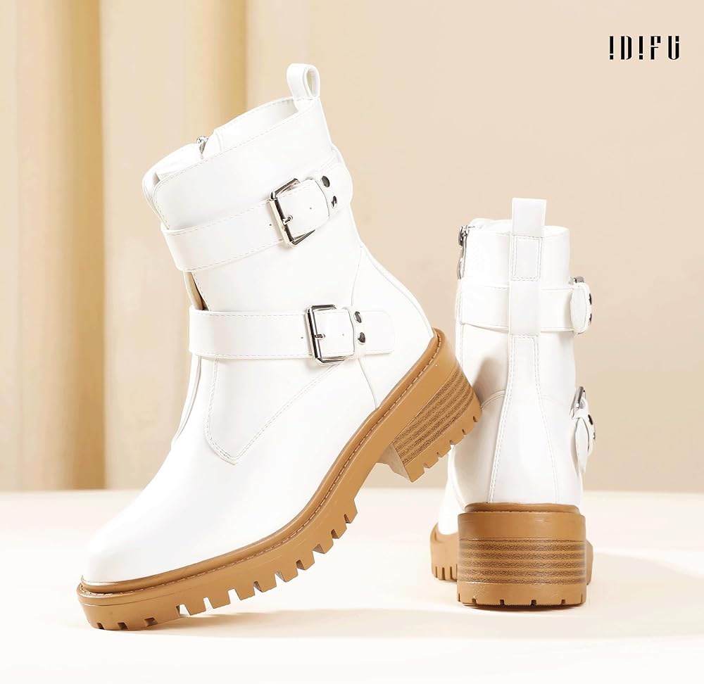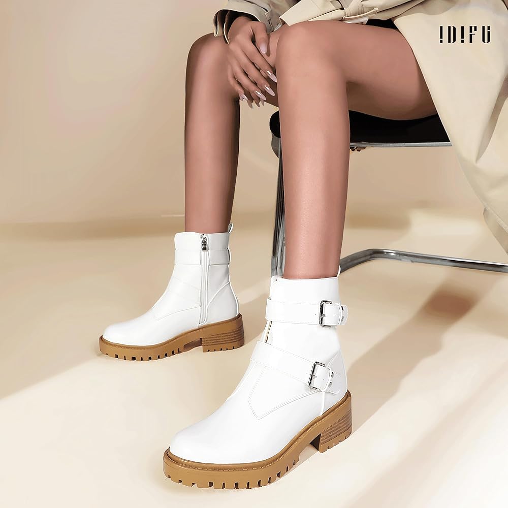 IDIFU Women's Ankle Boots Combat Motorcycle Biker Boots Moto Two Buckles Lug Sole Chunky Low Heel Short Boots Dressy Side Zipper Comfortable Boots Booties for Women