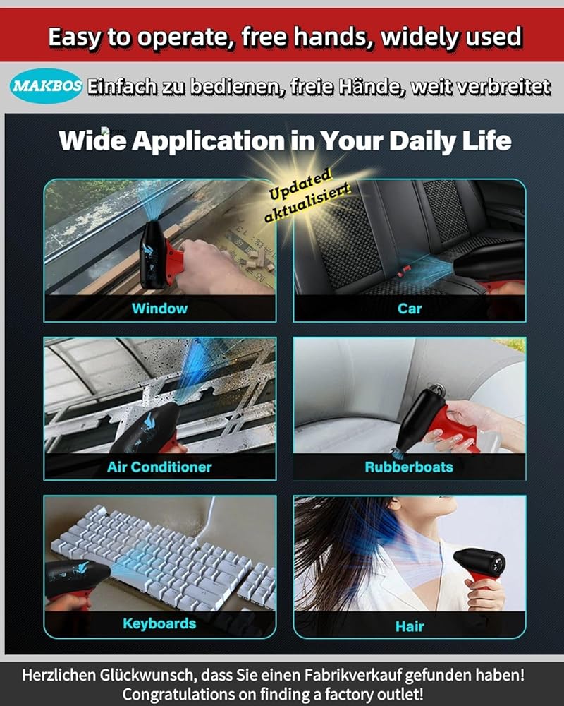 【powerful and portable】Experience unrivaled airflow with the Jet Dry Mini Blower. With a maximum air speed of over 30 meters per second, it's ideal for car drying, cleaning, camping and outdoor activities. The fan blades are designed with CNC technology to generate over 30 meters per second of pressure and velocity, resulting in a powerful blast of cool air. In addition, the jet blower is compact and easy to carry around.