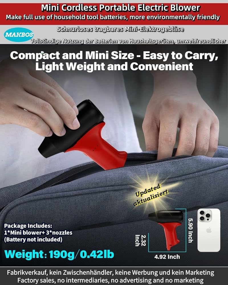 【Compatible with Milwaukee 12V M12 Battery】Electric Jet Dry Blower is suitable for Milwaukee 12V battery .If you already have Milwauke battery lying around at your home, this cordless dust blower kit will help to save cost on purchasing (Battery not included)