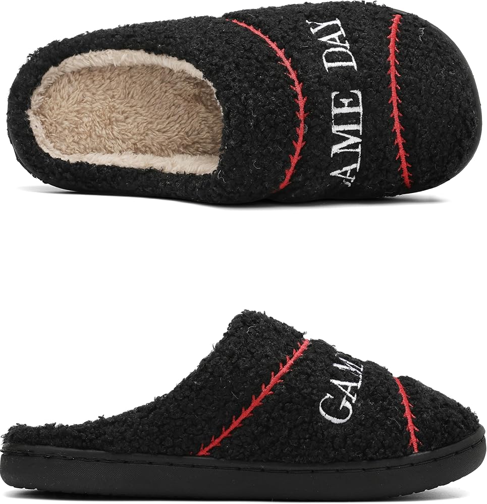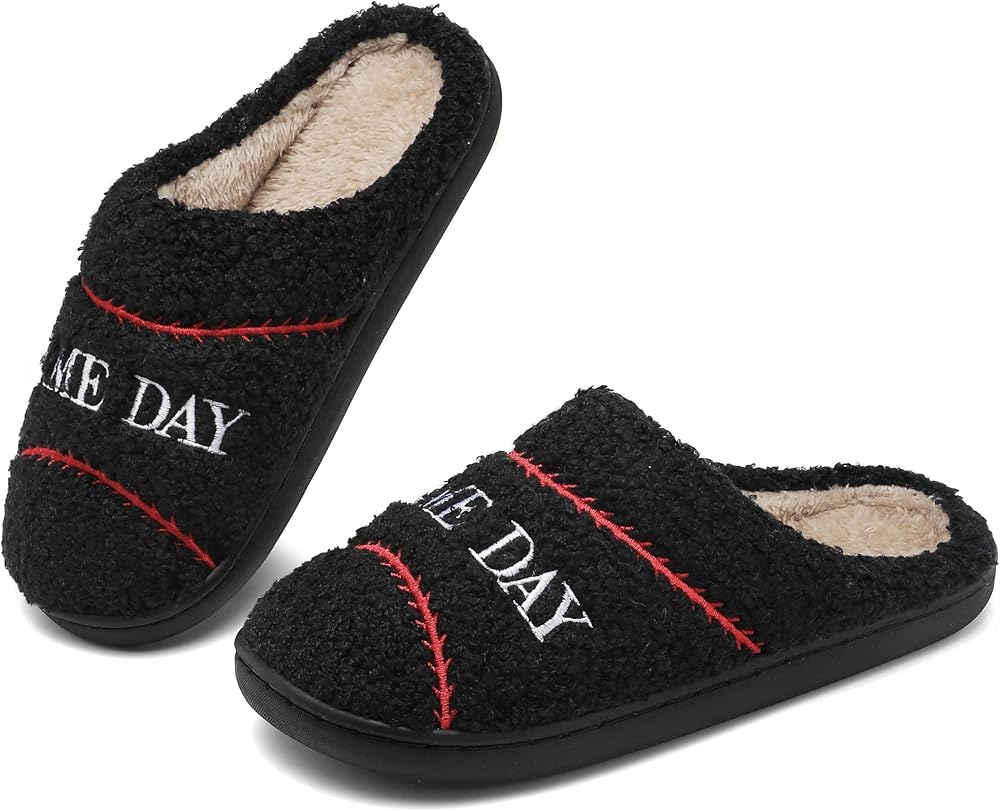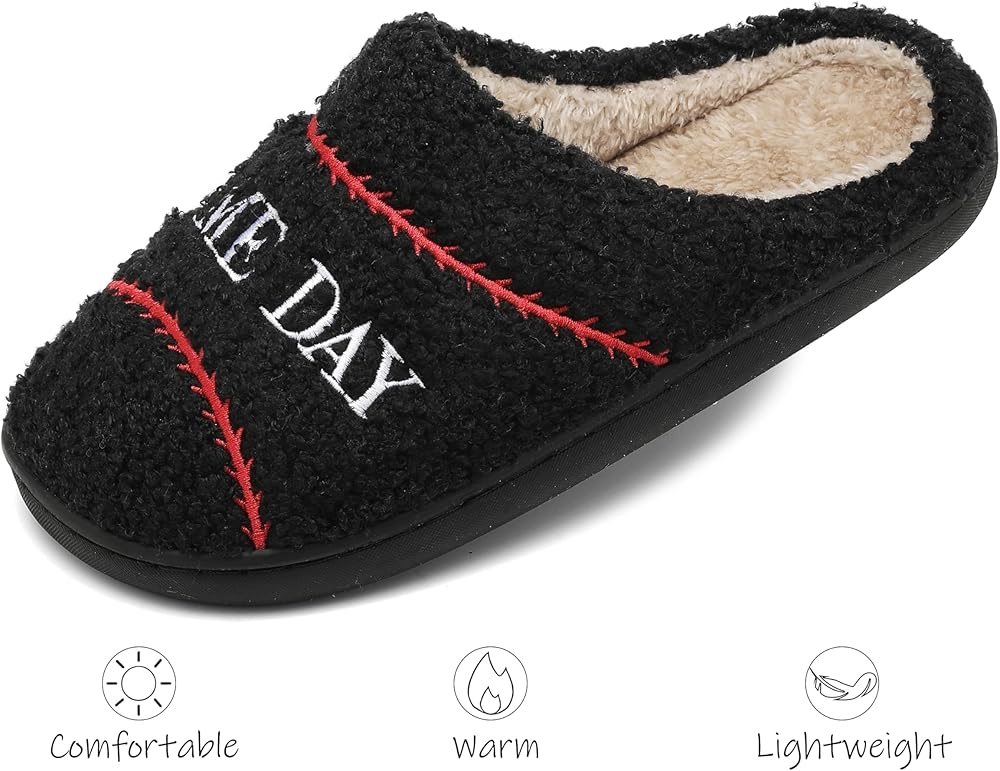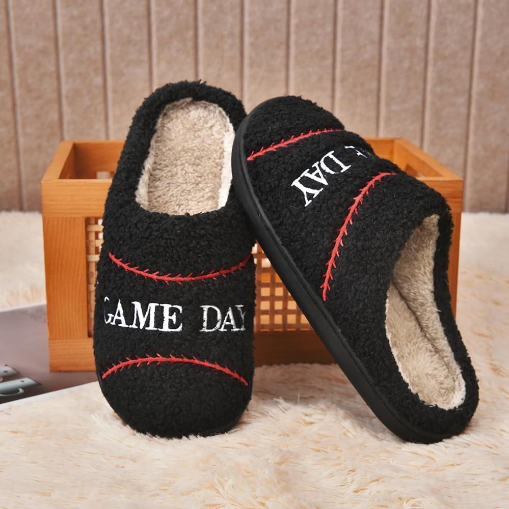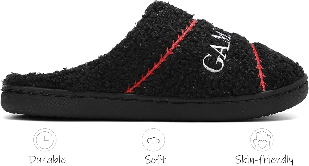 Ultra-Soft Wool-Like Plush Fleece Lining: These unisex, ball-themed slippers have a convenient slip-on design, with a cozy man-made cuddly fluffy fleece lining that fully wraps your feet and offers soothing comfort.