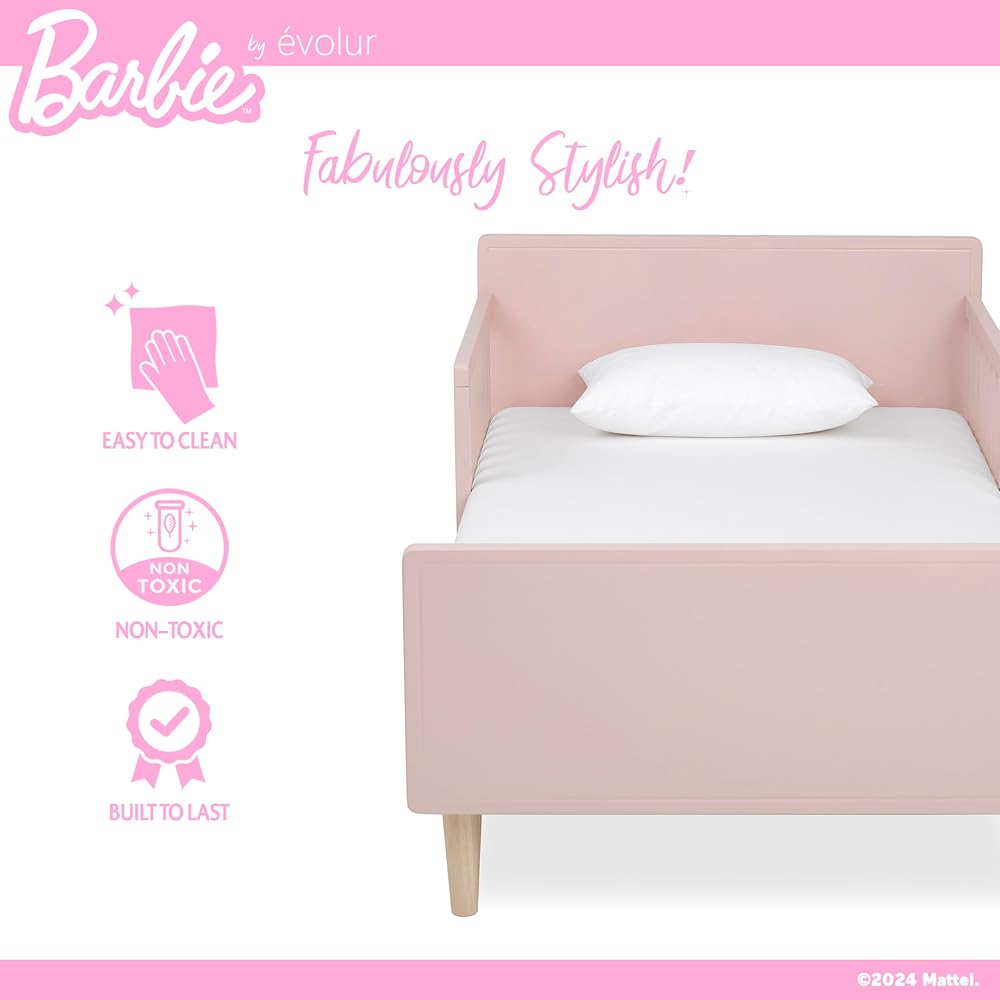 Go on an enchanting journey with your little one as they transition to their first big-kid bed with the BarbieTM Los Altos Toddler Bed by Evolur. As your child grows, so does their sense of independence and confidence. Crafted with love and attention to detail, this sturdy and stylish toddler bed is designed to make bedtime a fearless experience for your child. Rest easy knowing that the Barbie™ Los Altos Toddler Bed is JPMA certified, ensuring the highest standards of safety and quality. Choose from three delightful variations - Blush Pink, Vanilla Cream, or Lavender Sky - each offering its own unique charm and personality. With the Barbie Los Altos Toddler Bed, let their imagination soar as they drift off to slumber! Product dimensions are 54.2” L x 29.5” W x 23.2” H.