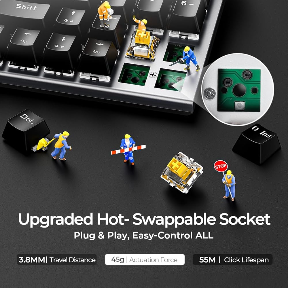 【Hot-Swappable Keyboard: Magnetic Red Switches】Different from other ordinary mechanical keyboards,this mechanical gaming keyboard uses magnetic axis switches. This type of switch has the characteristics of no shrapnel, the switches goes straight up and down and do not require lubrication. It is smoother, quieter and has a longer service life than other switches.The hot-swappable feature gives everyone more possibilities for DIY.