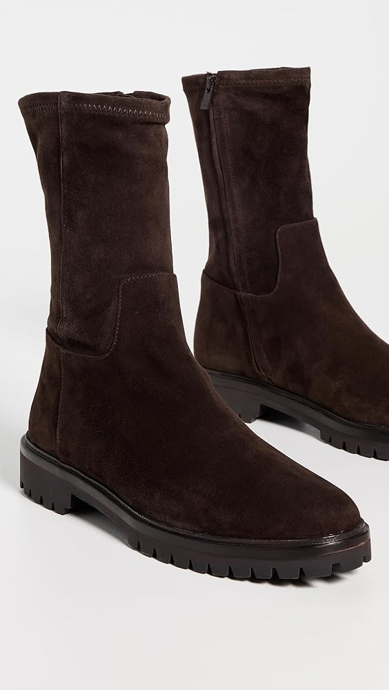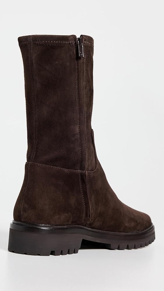 Mid shaft lug sole boot in black stretch leather. Features a padded footbed, round toe, and zip closure. 0.5 inch heel.