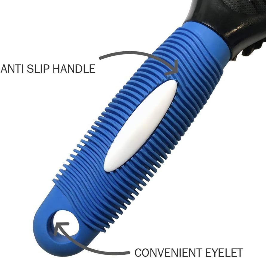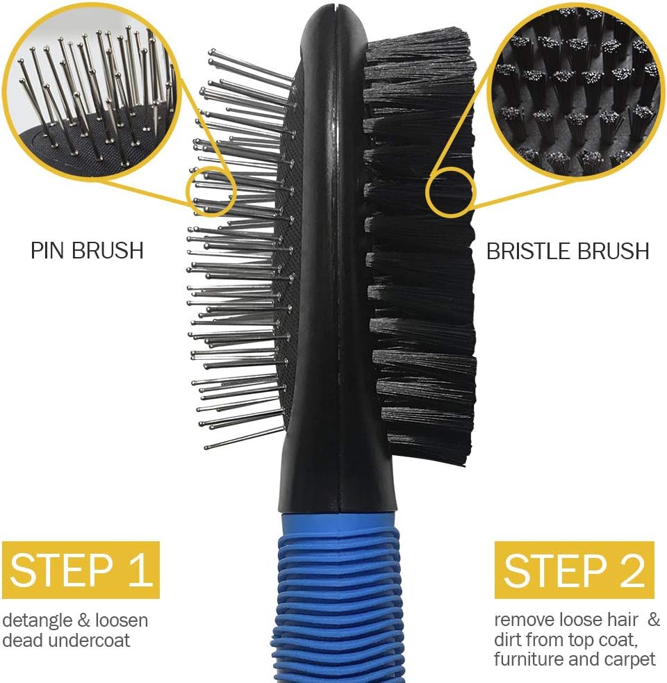 The pin side helps to give your pet a great massage experience and remove loose hair; The bristle side helps to remove tangles, dirt, and loose hair, making the hair cleaner and shiner