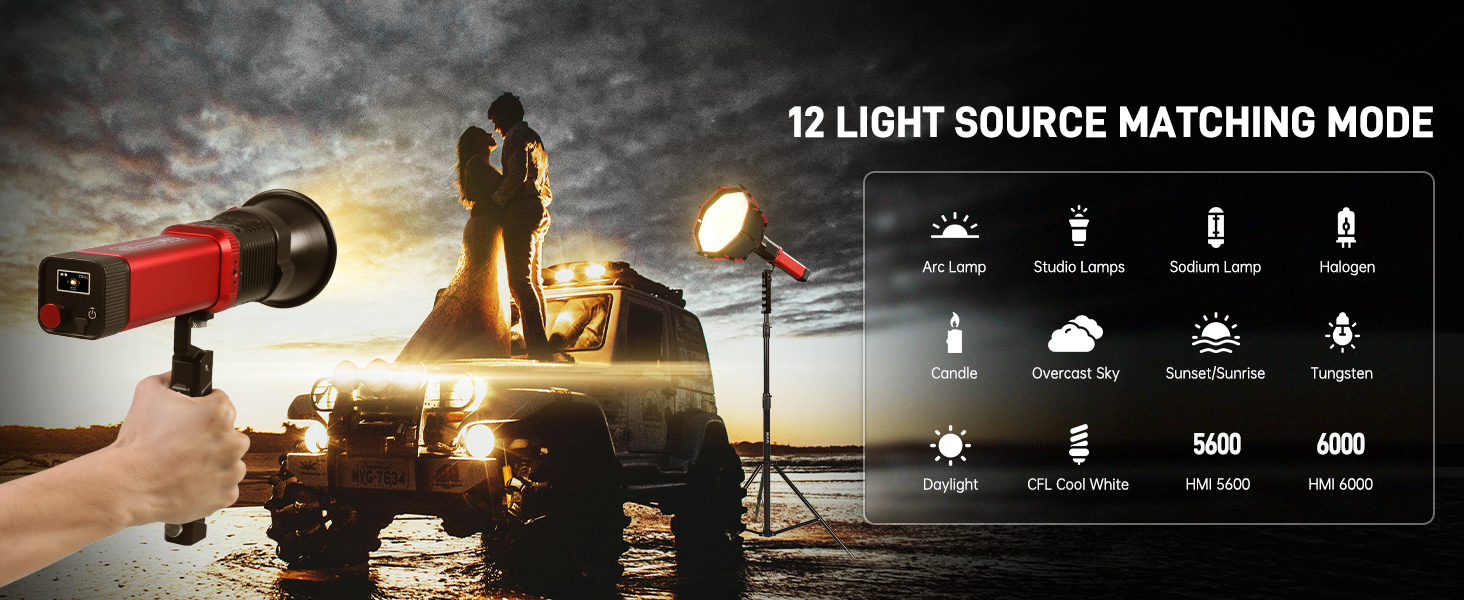 【12 Lighting Effects for Use】12 light scenes and 12 light sources on this COB studio light are preset. 12 light scenes include CCT loop, candle, bad bulb, TV, explosion, ect. 12 light sources include HMI 6000, candle, sunset/sunrise, daylight, overcast sky, ect. Using this video light can quickly adjust the light scenes or light sources to capture the moments your desire