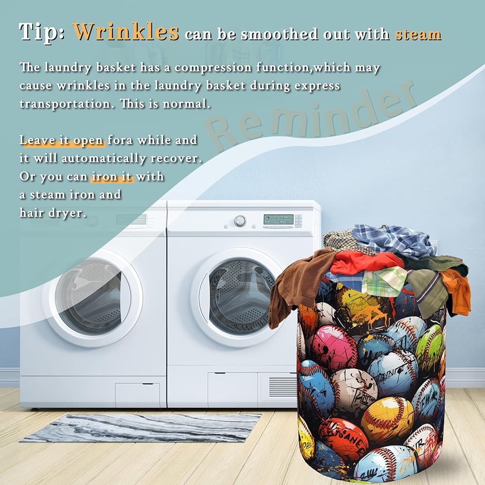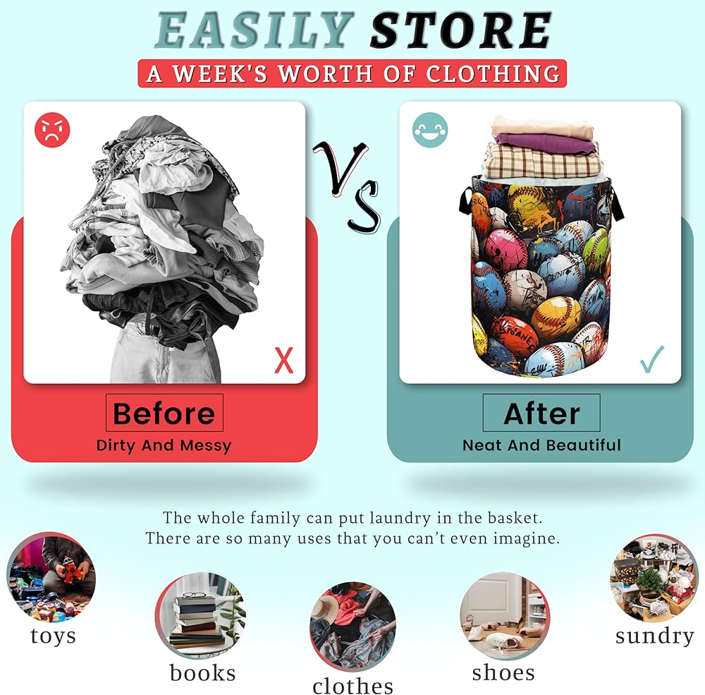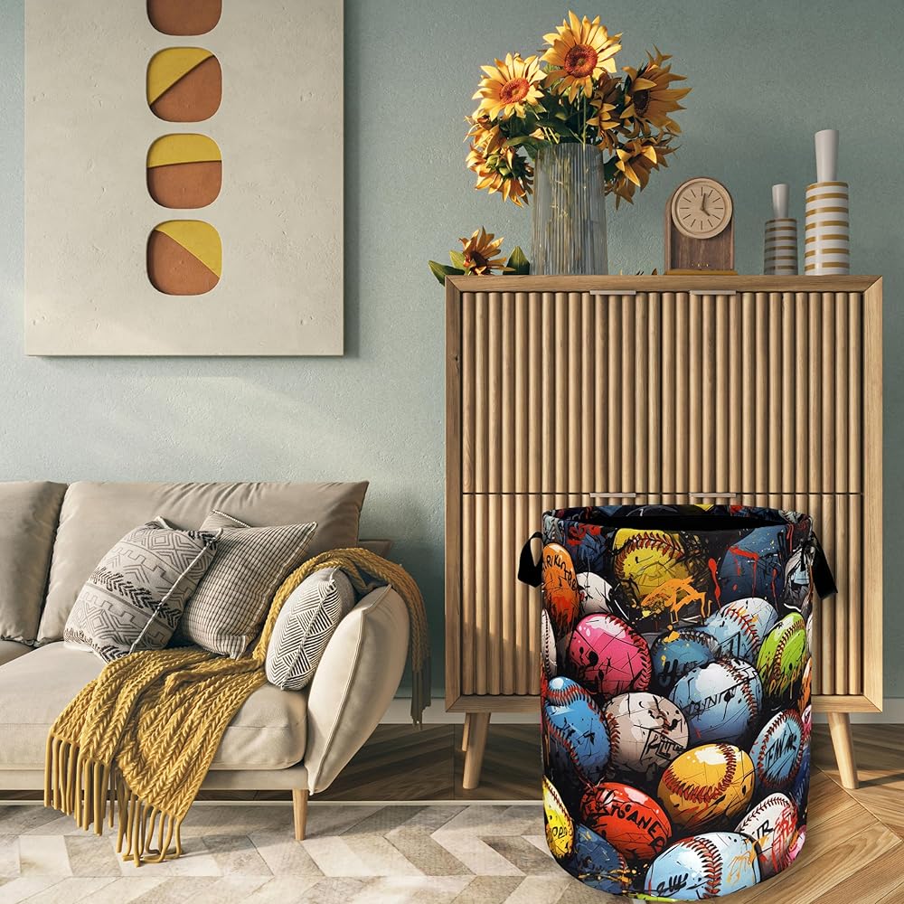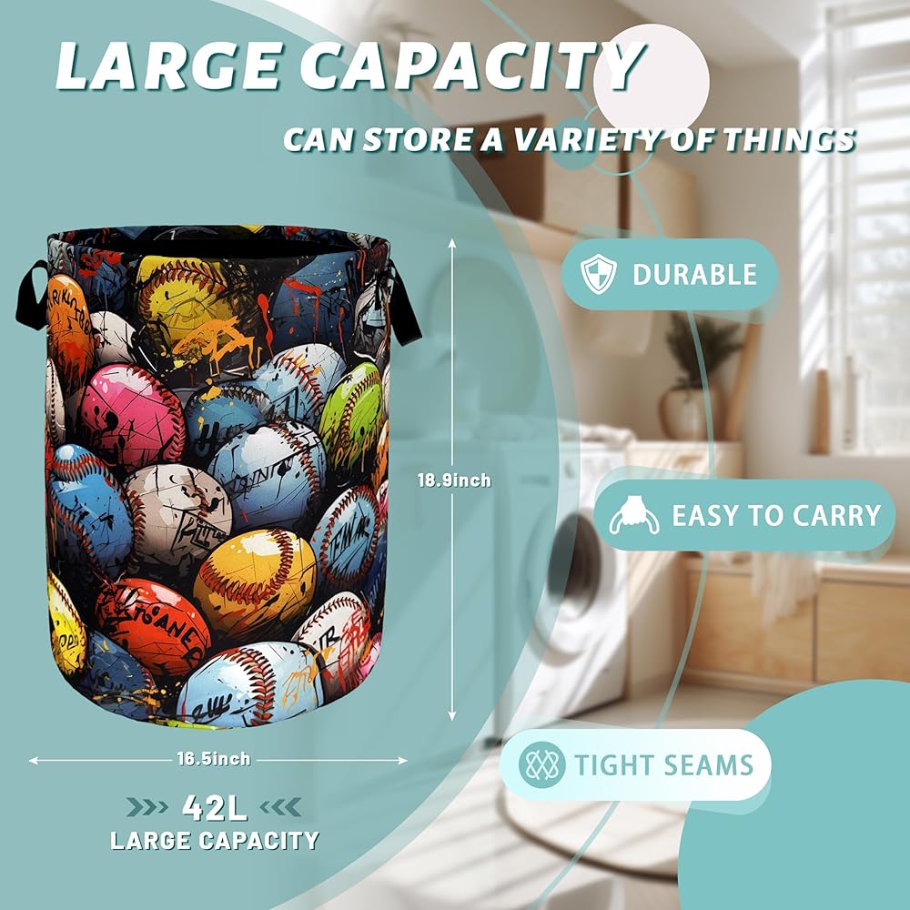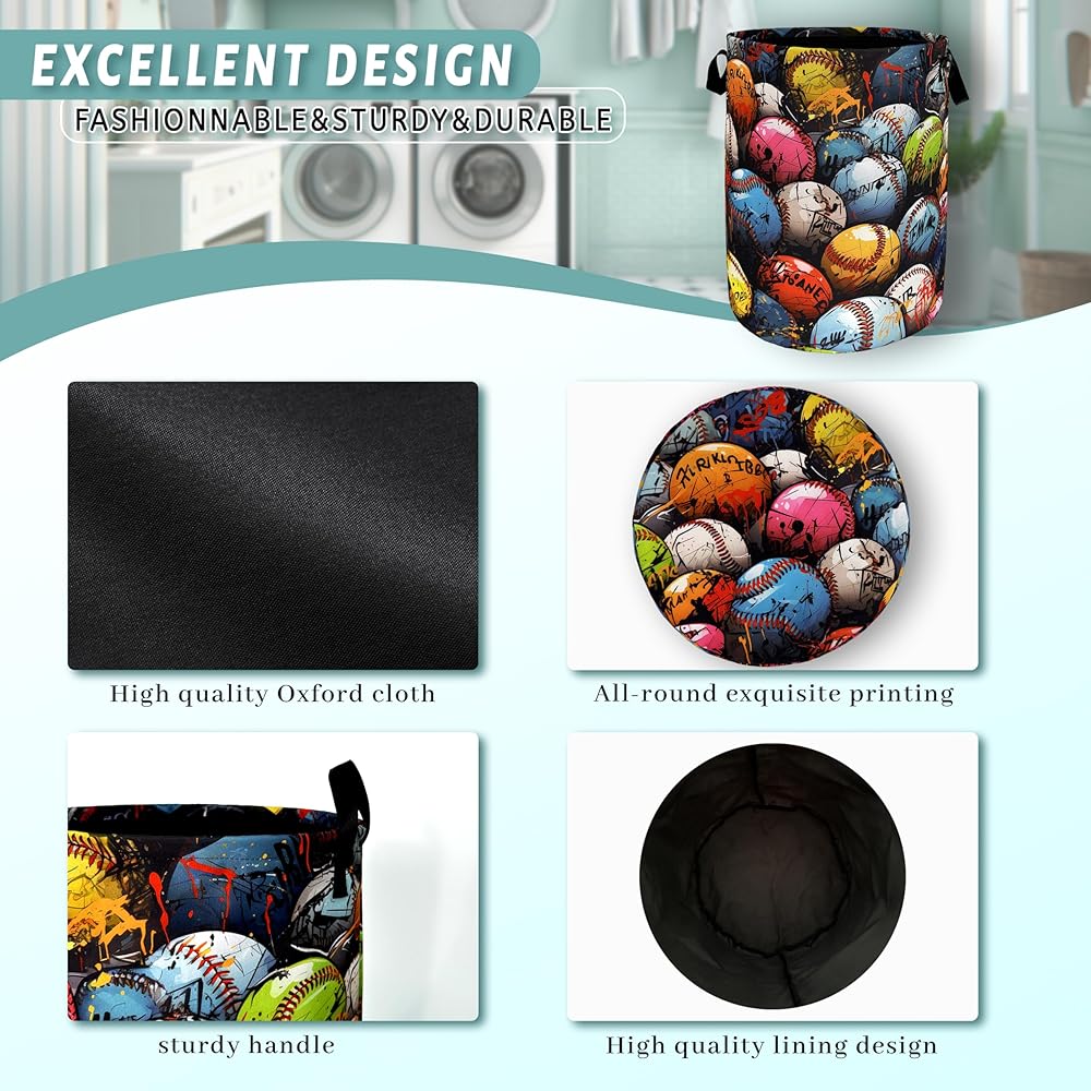 Colorful Baseball Laundry Hamper Foldable With Handles Balls Tote Bag Universal Oxford Cloth Funny Laundry Basket Clothes Toy Storage Bucket 18.9" x 16.5" For Bathroom/Laundry/Bedroom