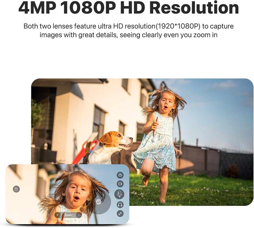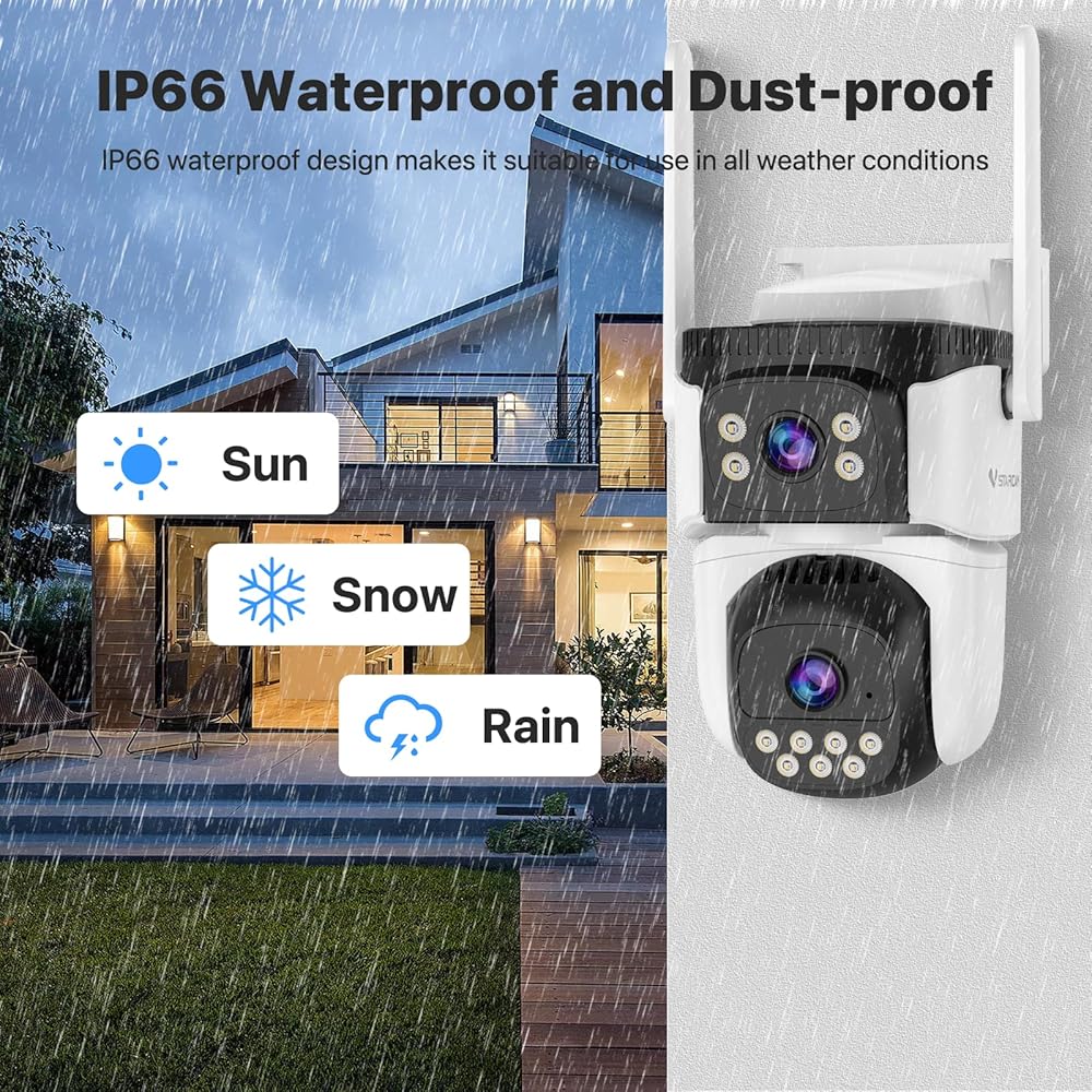 【2 In 1 Outdoor Camera】WiFi security camera comes with dual lenses: a fixed wide angle lens to focus on the whole house and a tracking ptz lens to capture more details in motion detection, you can see two areas simultaneously on one screen with no blind spots