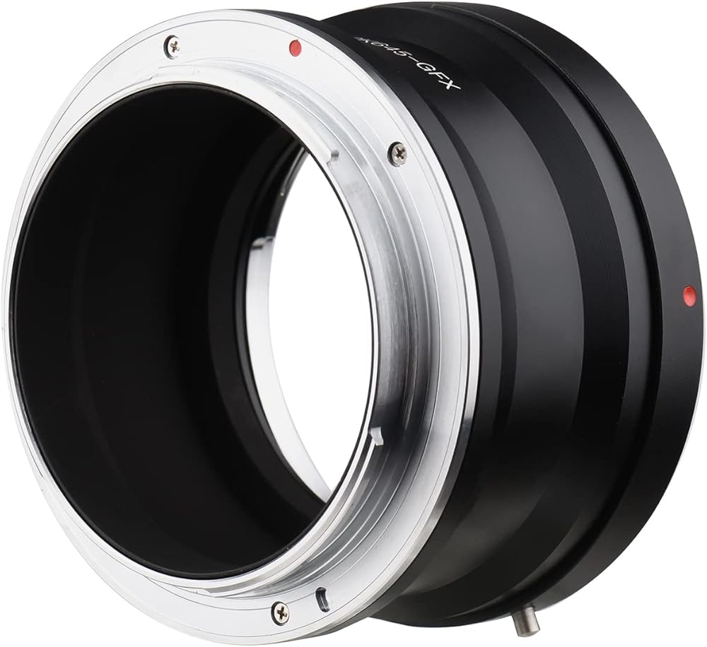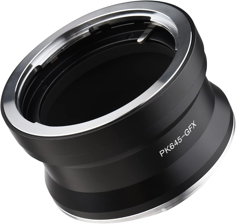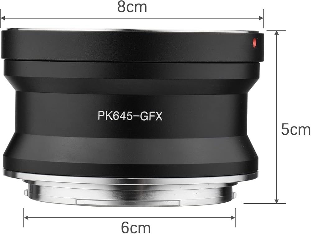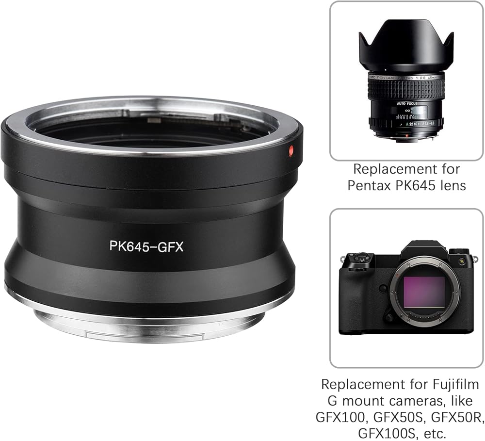 Features: Specially designed replacement for Pentax PK645 lens to Fujifilm G mount cameras, like GFX100, GFX50S, GFX50R, GFX100S, etc. Both of sides can fit well with lens and camera, no gap and no wiggling, easy to install, can be easily removed when not in use. Not affect camera's normal use, automatic diaphragm (AE metering) and other auto functions still work with this adapter ring. Made from high-quality metal, precisely machined, with well-plated surface, rust-proof and durable for use. For most cameras lens, it supports infinity focus for more professional photography, making your masterpiece distinguish from others! Specifications: Color: Black Material: Metal Product Size: 8 * 6 * 5cm/ 3.1 * 2.3 * 1.9inch Product Weight: 218g/ 7.6oz Note: The camera and lens showed in the pictures are not included. Package List: 1 * Adapter Ring