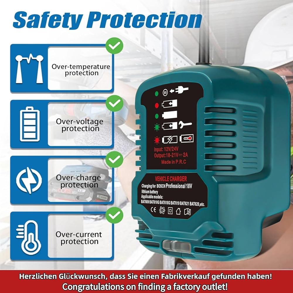 [Widely Applicable Scenarios]- Cigarette Lighter Plug Charge for Bosch 18 Volt batteries whether on the way to job site, traveling between jobs, camping, power failures, or anywhere household power is not available.