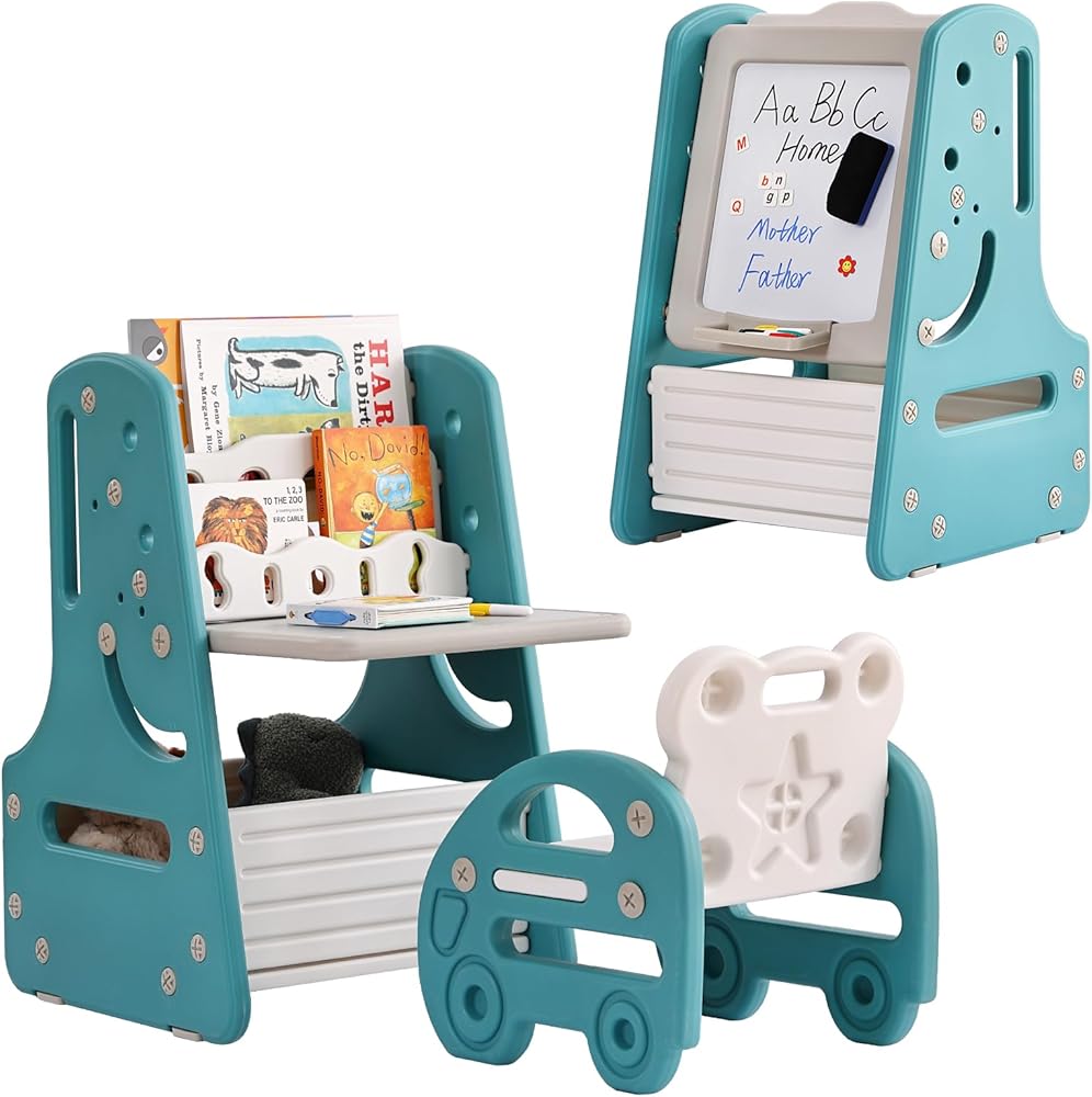 Tiita Kids Table and Chair Set, 3 in 1 Convertible Art Easel & Display Bookshelf w/Magnetic Painting Board, Bottom Storage Shelf, Children Activity Table Set for Drawing Reading, Blue