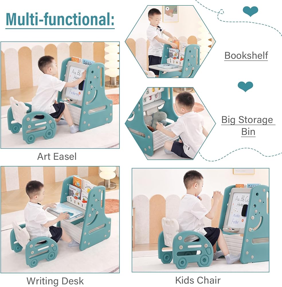【Package Include】1x Multi-functional Drawing Board+ Desk+ Bookshelf+ Big Storage Bin 1x Kids Car Chair. Table: 27.6"x 18.5"x 17.3". Chair: 14.6"x 14.2"x 16.3".