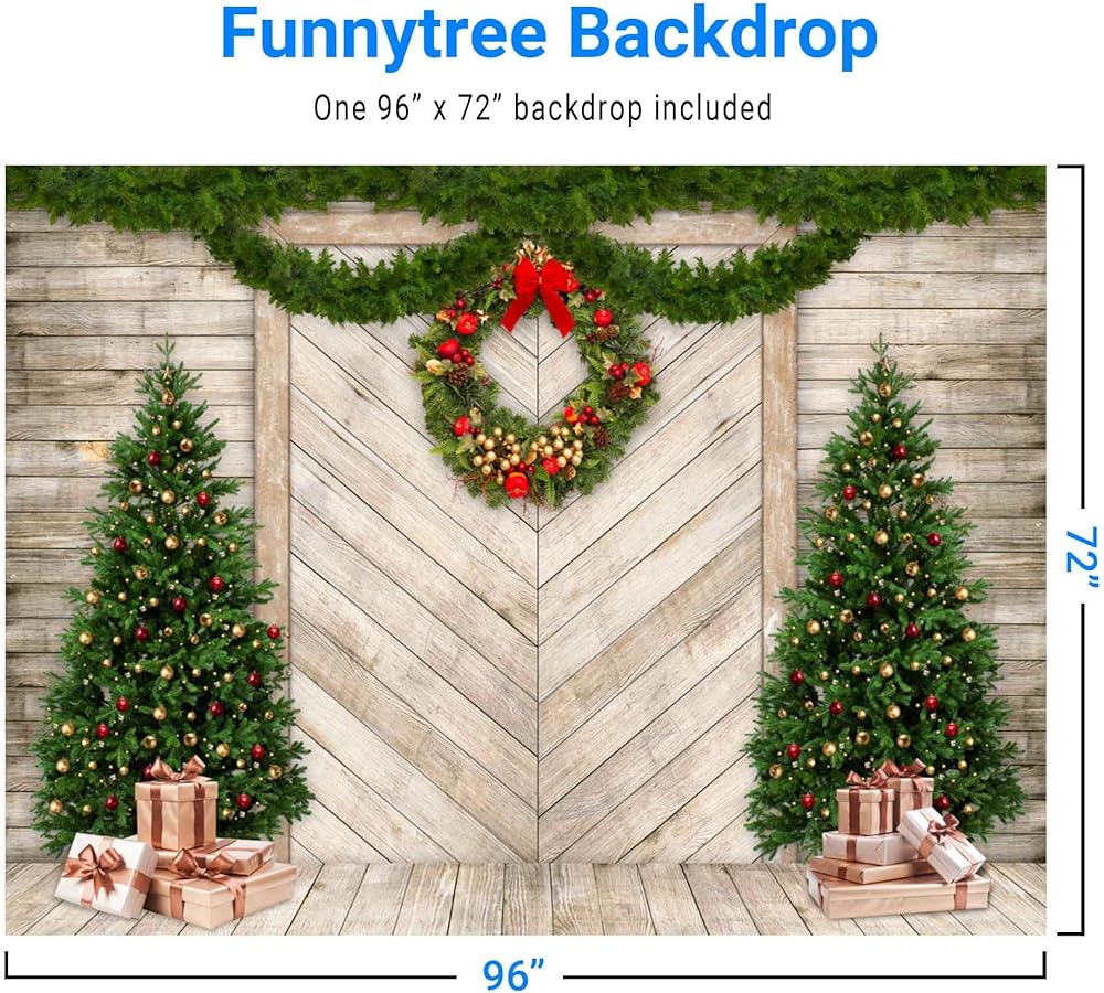 Funnytree 8x6FT Christmas Wood Door Photography Backdrop for Xmas Decoration Pine Tree Gifts Rustic House Background Photo Booth Shoot