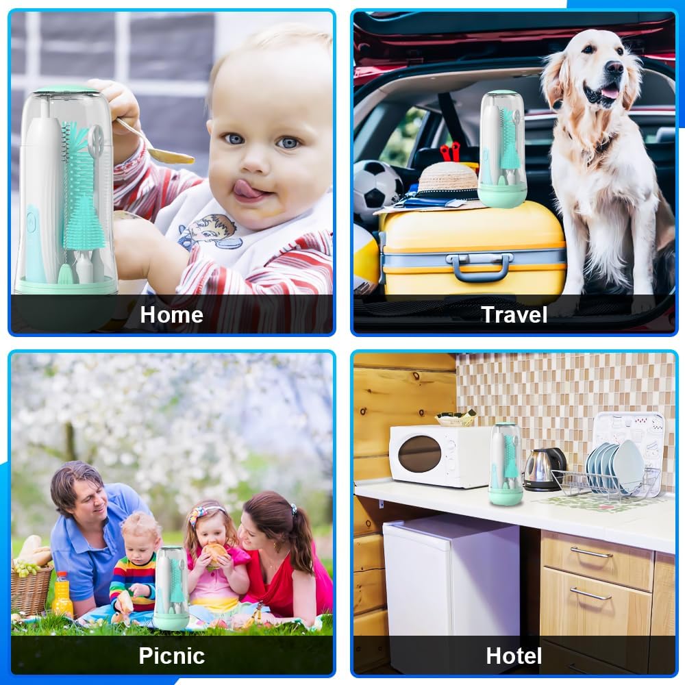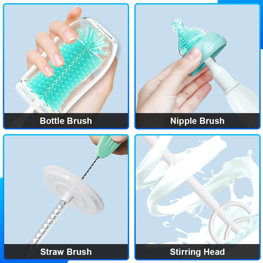 6 in 1 Electric Bottle Brush Cleaner: Our 6-in-1 Baby Bottle Brush Cleaning Kit includes a motorized bottle brush, nipple brush, straw cleaning brush, stirring head, drain rack and storage case. The milk powder stirring head is enough to clean all kinds of cups, providing more convenience for new moms. Each item has its own place, well organized and clean.