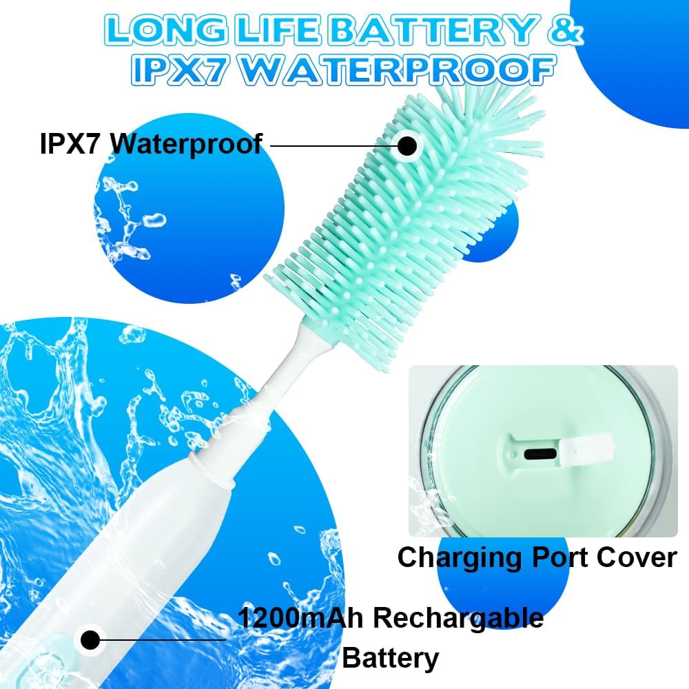 Multifunctional Detachable and Waterproof: The brush head of the electric bottle brush is detachable and can be replaced with other brush heads to meet the cleaning needs of different parts.The nipple brush is designed to resemble the shape of a nipple, removing nipple milk dirt without any dead ends. High-density nylon straw brush easily solves the problem of straw cleaning. Designed with IP67 Waterproof, body washable, and waterproof, but fully immersing in water is not recommended.