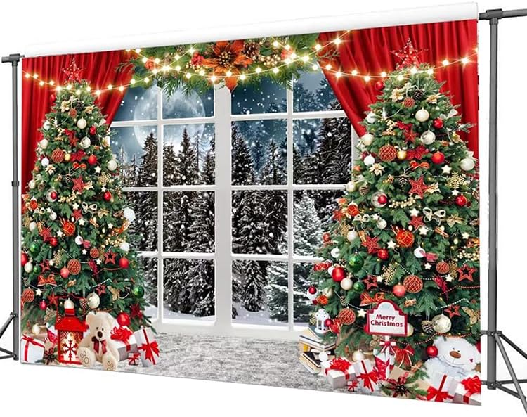 Dudaacvt 8x6ft Christmas Window Photography Backdrop Winter Merry Xmas Tree Background Night Snow Party Decoration Holiday Photo Banner Props