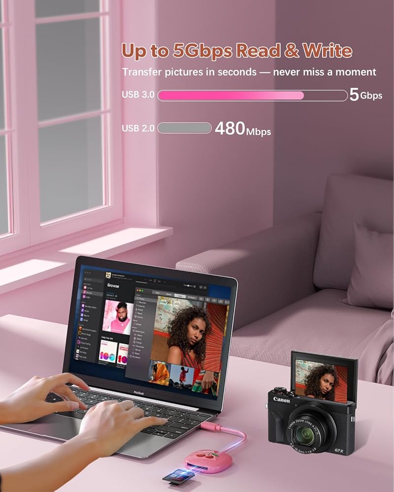 【Instant Sharing and Storage】This sd card reader USB C offers lightning-fast transfer speeds of up to 5Gbps, letting you instantly shareshare your cherished moments with family and friends, In just seconds, you can transfer photos from your camera to your iPhone or iPad. It supports editing travel videos and easily uploading snapshots to social media. Plus, with its ability to transfer images or video files to a memory card with a large capacity, you don't have to worry about running out of phone storage.
