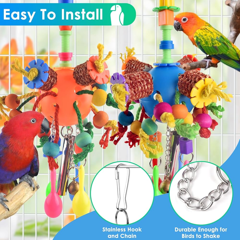PARROT FAVORITE: The bird hanging toys are pet-safe, non-corrosive, chew-resistant and with sturdy. A very stimulating toy for small birds such as parakeet, cockatiel, sun conure, mynah, lorikeet etc