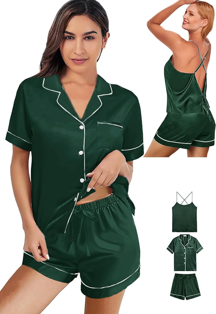 PAJAMAS SHORT SETS PLUS VERSATILE CAMISOLE TOPS: This 3pcs Pjs is not only one pajama set but also with basic spaghetti straps camisole tops can be paired with jeans, shorts, leggings, long pants, skirts, shirts, coats, jackets etc, create an elegant and stylish look. 1xshort sleeves pajama shirt+1xshorts+1xcami top=Total 3pcs per set.