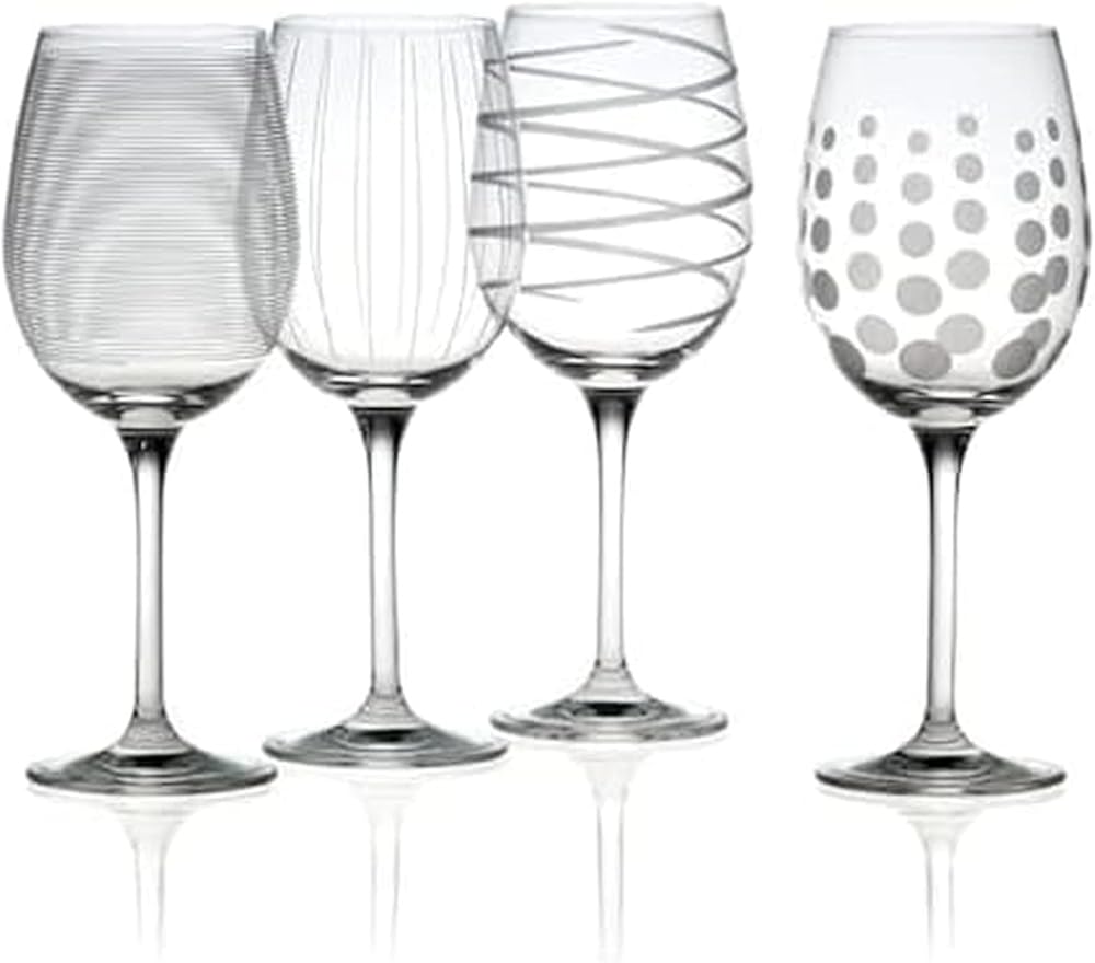 The fun and whimsical designs of the Cheers collection set a festive mood at any gathering. Each glass in the set of 4 is precision-etched with a different yet coordinating design. The dots, lines, and swirls are also distinctive, so each of your guests can easily identify their glass. Hand wash recommended. Set of 4 flute glasses, each holds 8 ounces.