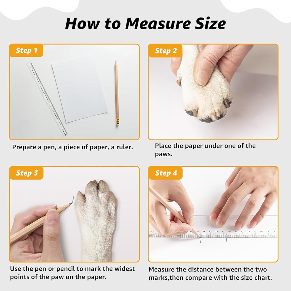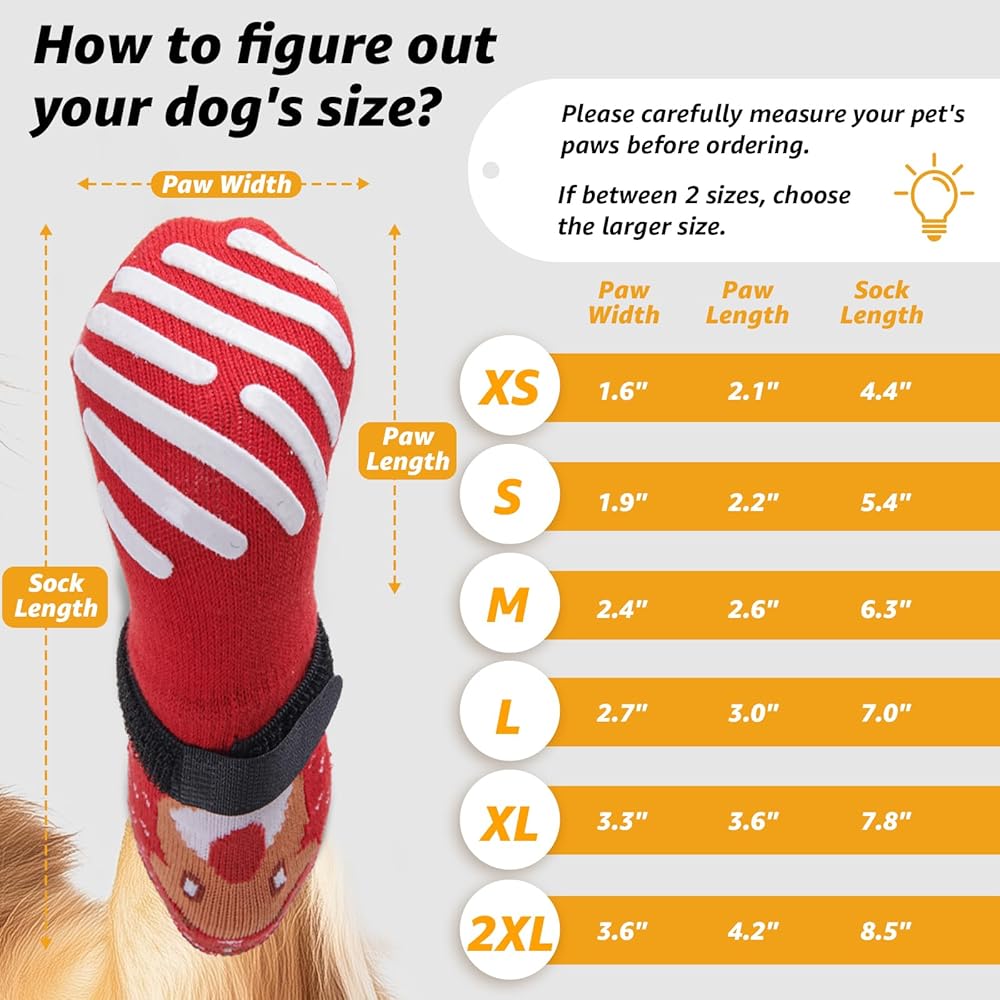 Size L: Paw width 2.7 inch, paw length 3.0 inch, sock length 7.0 inch. Measure before purchasing to ensure the right fit. If between sizes, choose the larger one. Includes 4 soft, stretchy cotton socks for comfort