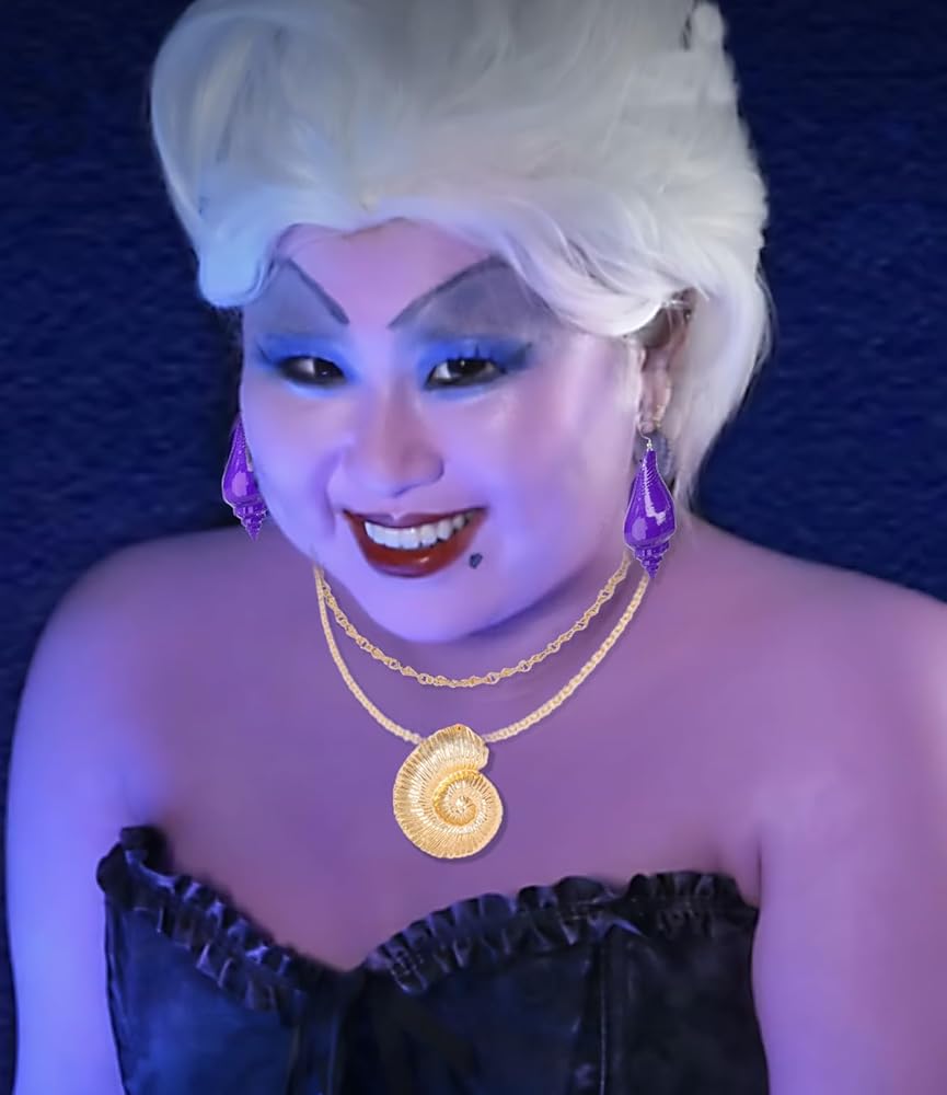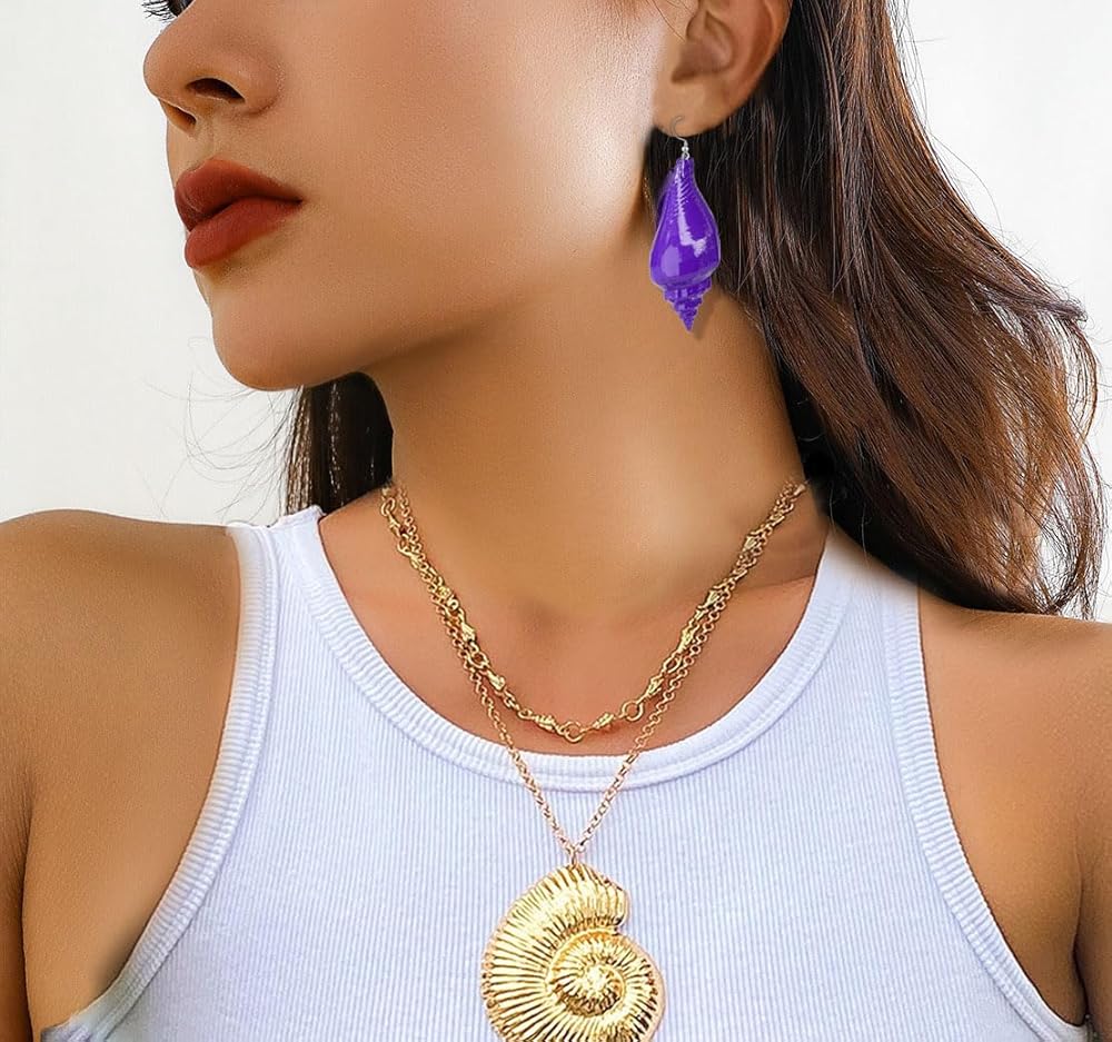 STUNNING PURPLE SEASHELL EARRINGS – The set features shell earrings made from natural seashells, hand-painted in purple, adding a unique touch to your ursula halloween costumes for women or ursula accessories.