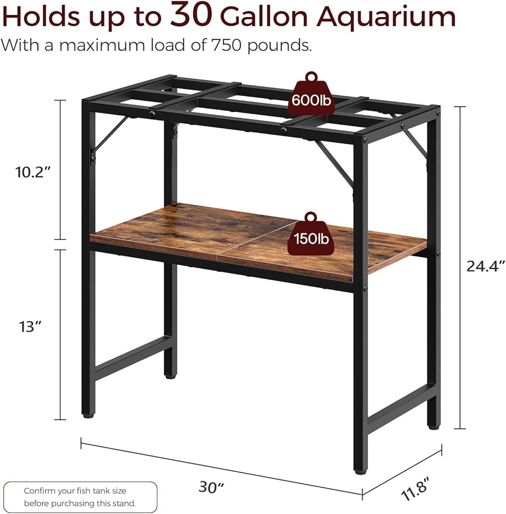 Fits 30 Gallon Aquarium: At 30.0”L x 11.8”W x 24.4”H, the fish tank stand fits tanks up to 30 gallons, The top bears up to 600 lb, the second shelf 150 lb, and a total weight limit of 750 lb. Please confirm the sizes before purchasing for your needs