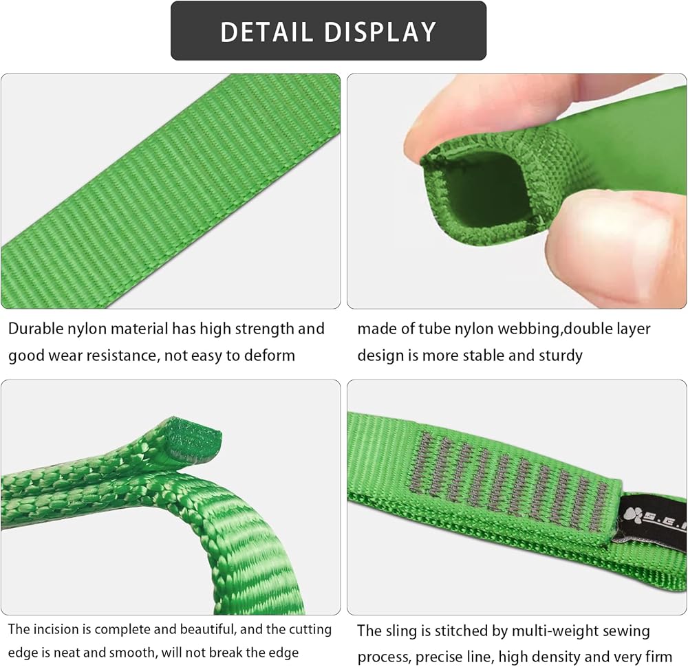 Various Activities: Nylon straps are often used to connect ATC during rock climbing and descent, or to secure the user to a protective station in multiple sections. It can be used for tree trimming, positioning, rigging, ziplining, anchoring, climbing, hanging, stretching, bundling, saddle hunting, hammocks, and can also be used for extending positioning ropes. Its multifunctional use is loved by many people, such as arborist, line worker, mountaineer, outdoor enthusiast, fitness enthusiast.