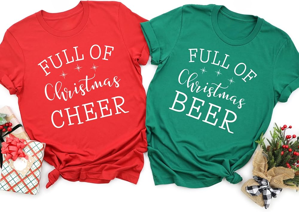 • Full of Christmas Beer & Full of Christmas Cheer: Hilarious matching shirts for couples, perfect for holiday parties and spreading festive vibes with a cheeky twist.