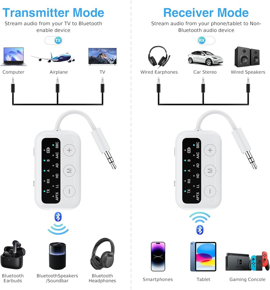 2-in-1 Transmitter Receiver: In TX mode, this Bluetooth transmitter can wirelessly stream audio from non-Bluetooth TVs, computers, and flight devices to Bluetooth headphones or speakers. In RX mode, it connects your smartphone to headphones and speakers via Bluetooth.