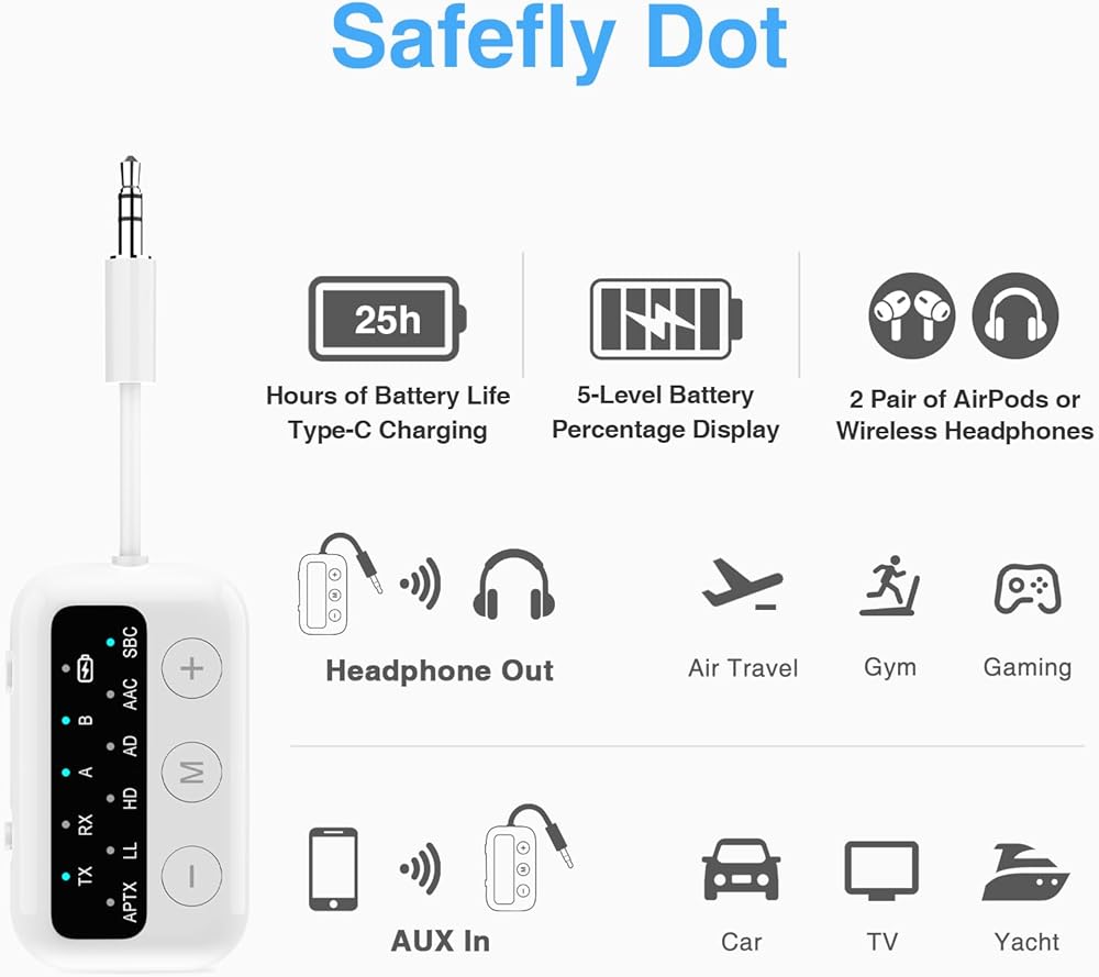 Ease of Use: This airplane bluetooth adapter has a clear and intuitive indicator panel. Through various light effects, you can easily identify the current connection mode/audio format/paired devices/battery level. Furthermore, its lightweight design is very convenient to carry.