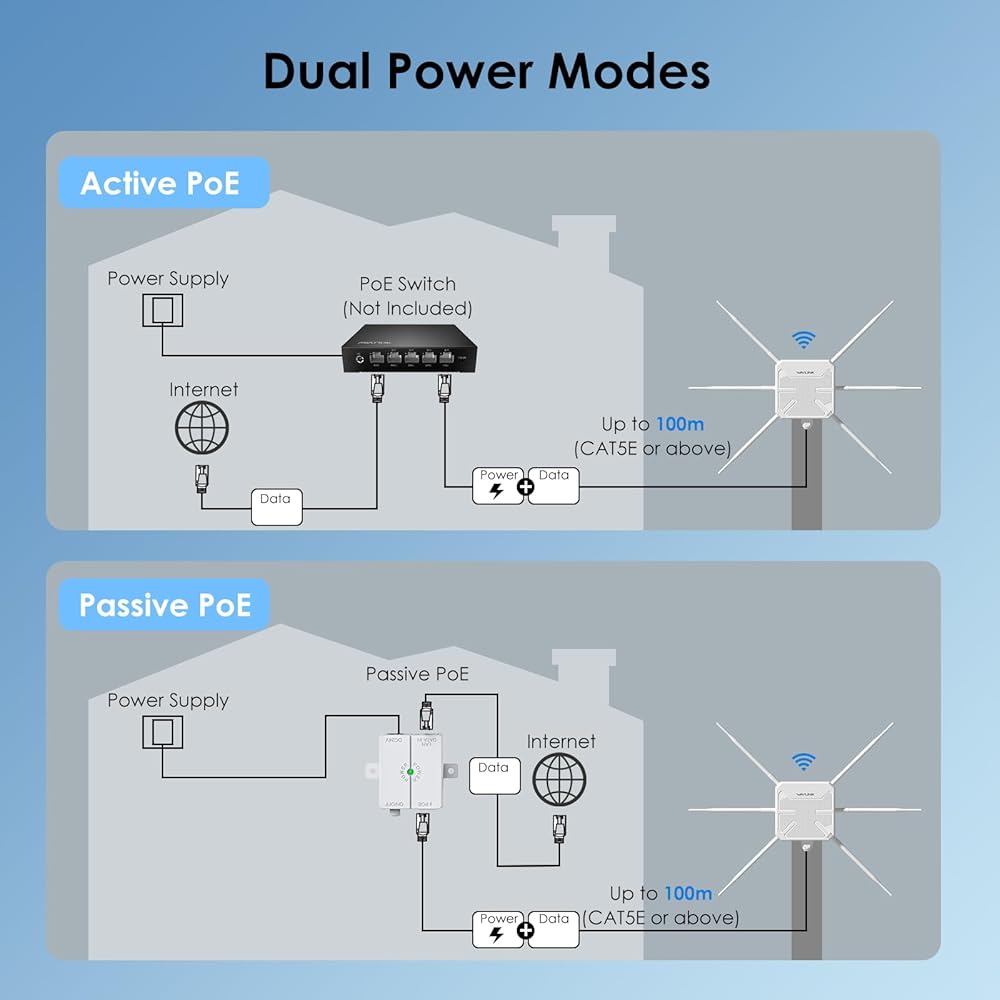 【Active & Passive POE Converter】Empower your outdoor network setup with optional PoE (Power over Ethernet) support. Compatible with both 802.3AF/AT active PoE and passive PoE. How to use the POE? Connect the power adapter to the POE box and then connect the AX3000 device to the POE port of the POE box. Note: The PoE converter is not waterproof. For optimal performance, use CAT5E or above cable within a 100m/328ft range