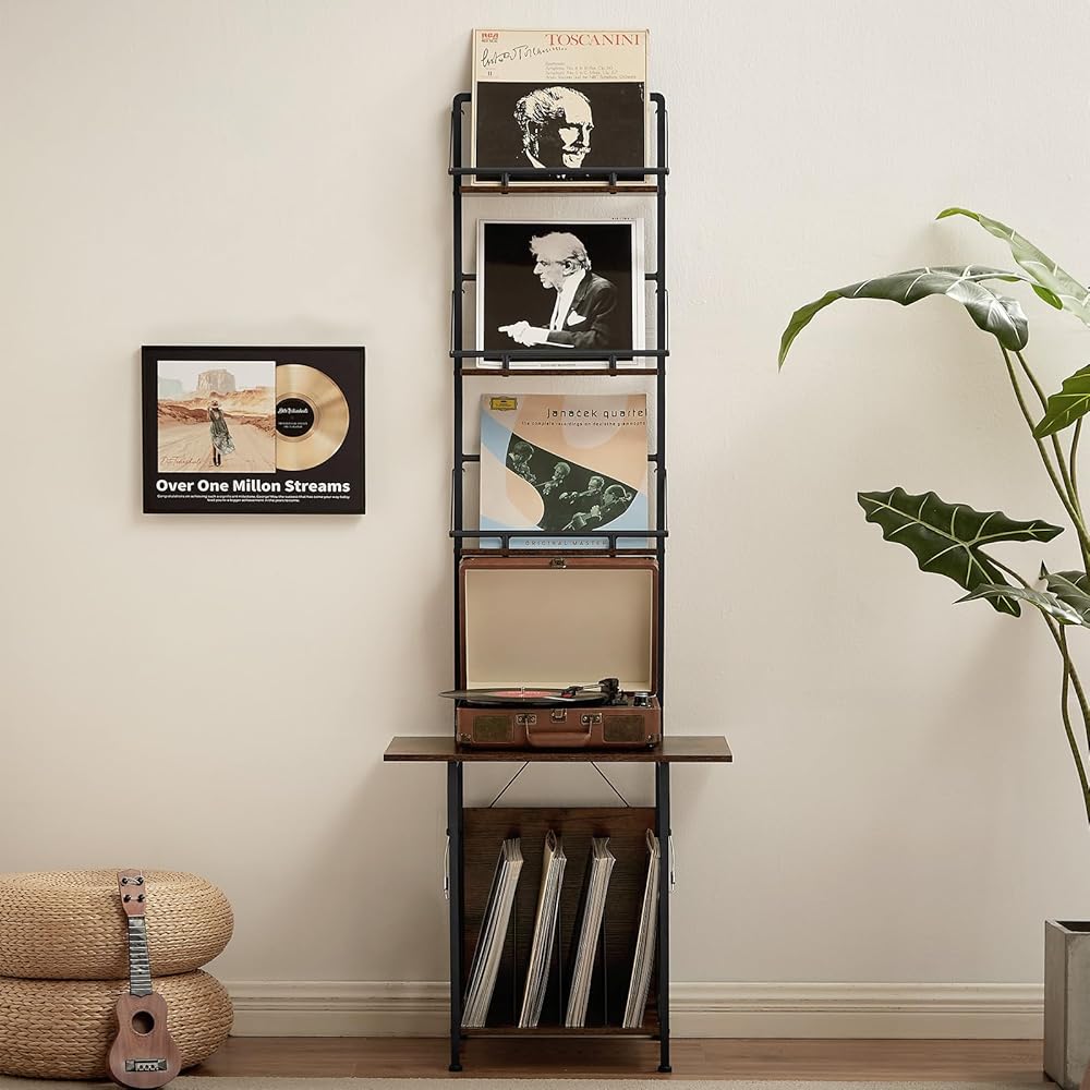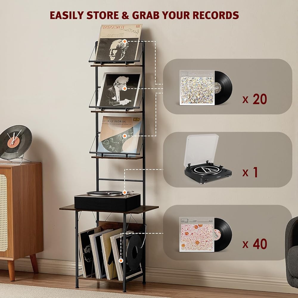 Vinyl Display & Music Enjoyment: The all-in-one display and storage design allows you to showcase your vinyl records while enjoying your music. With multi-tier storage, it's easy to find your records, and the ergonomic height ensures easy access without bending down