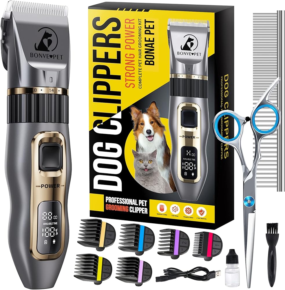 【All-in-One Professional Dog Grooming Kit】: Bonve Pet Dog Grooming Kit comes with 6 tools helping quickly and efficiently groom your dog: clippers for shaving pet hair, guide combs for trimming different hair lengths, stainless steel comb for getting rid of loose hair, stainless steel scissor for cutting long hair, oil and brush for maintaining and cleaning clippers respectively. Bonve Pet Dog Clippers Kit comes with everything you need to groom your pet!