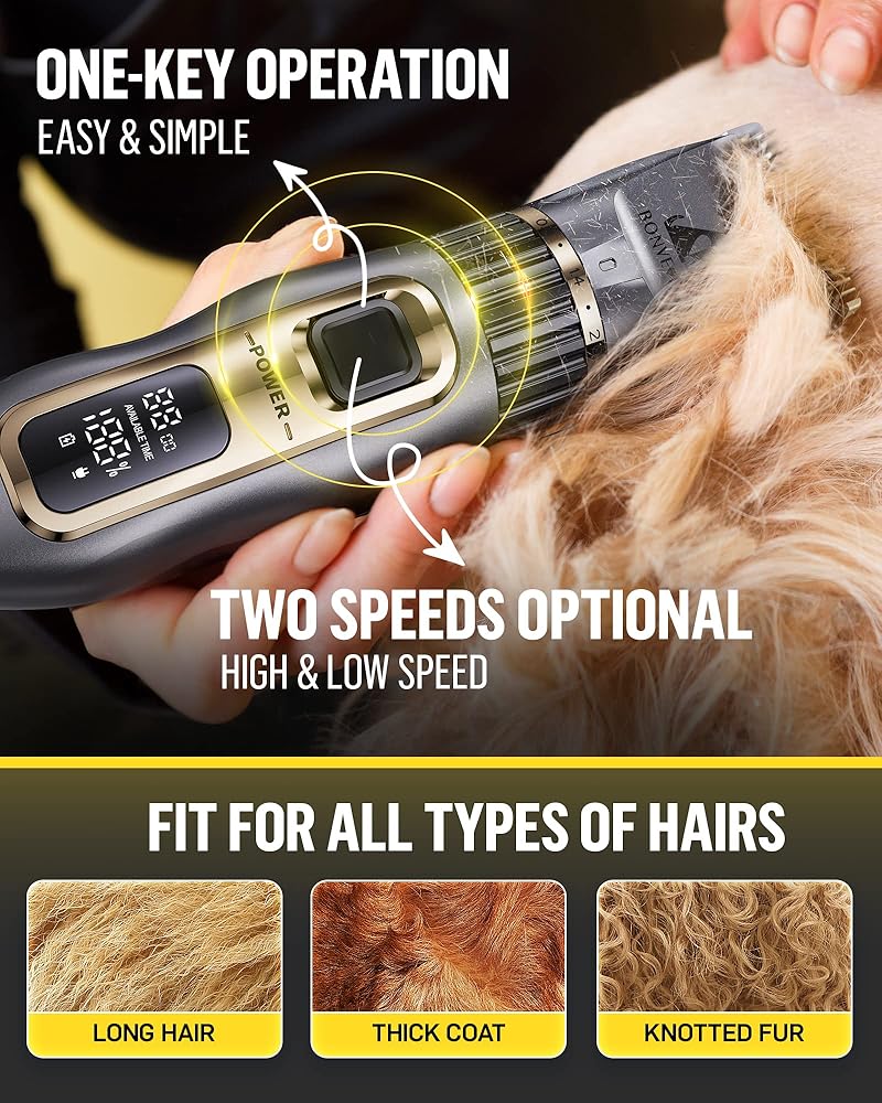 【6 Detachable Guide Combs & 2 Speeds Optional】: With 6 guide combs included, Bonve Pet Dog Grooming Clippers allow for precisely trimming your dog's hair to a desired length, suitable for small, medium and large dogs. Variable-speed pet hair clippers for dogs and cats are more versatile and effective for cutting through coarse hair or knots and tangles. Adjust between high or low speed to fit your pet's comfort need.