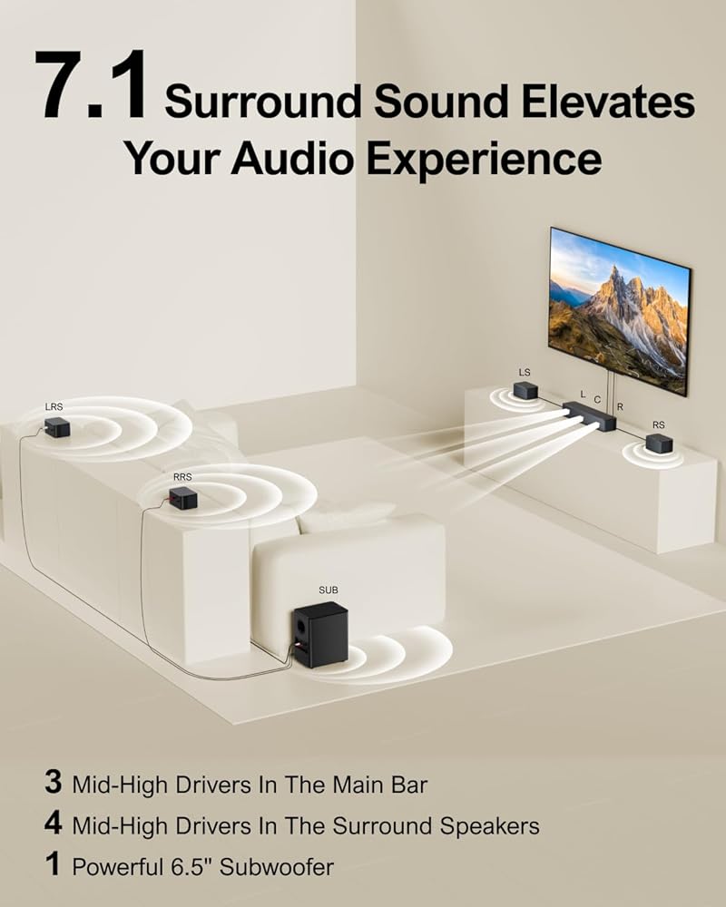 7.1ch Surround Sound System: Upgraded from the 5.1ch Poseidon D50, the Poseidon D70 meets more needs with enhanced surround sound. Enjoy crystal-clear dialogue from three main channels, 4 wired surround speakers, and a 6.5" wireless subwoofer for a wider sound field. (Note: Not compatible with Dolby Audio/Atmos.)