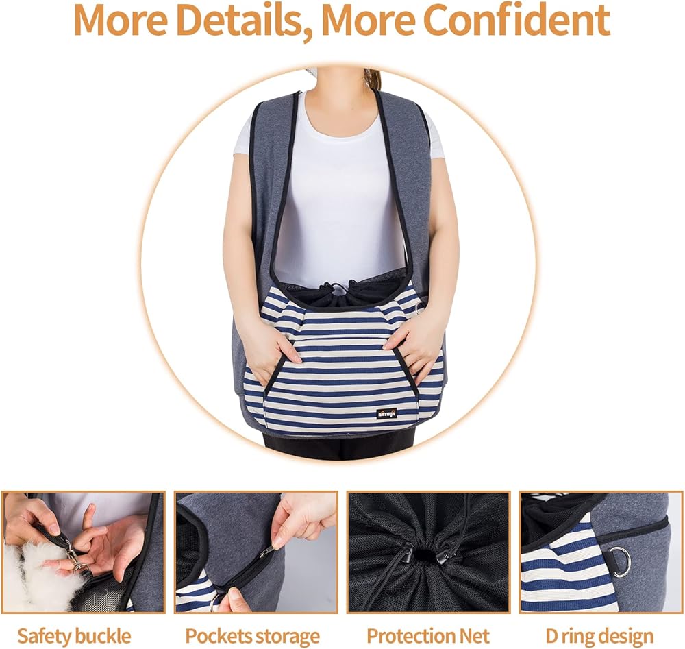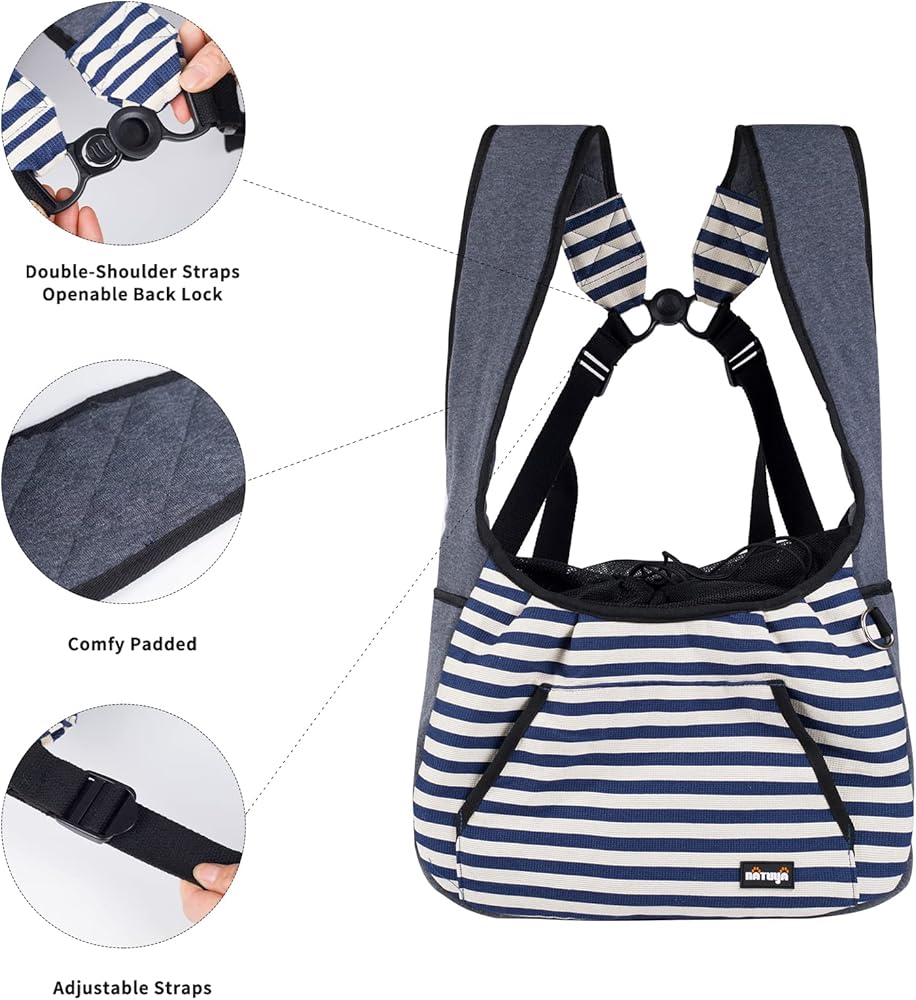 NATUYA Dog Sling Carrier Puppy Carrier, Adjustable Pet Front Sling Carrier Travel Bag with Bottom Pad, Pet Carrier for Small Dog Cat Puppy Traveling Hiking Camping (Bule Strip, 8-15 lb)