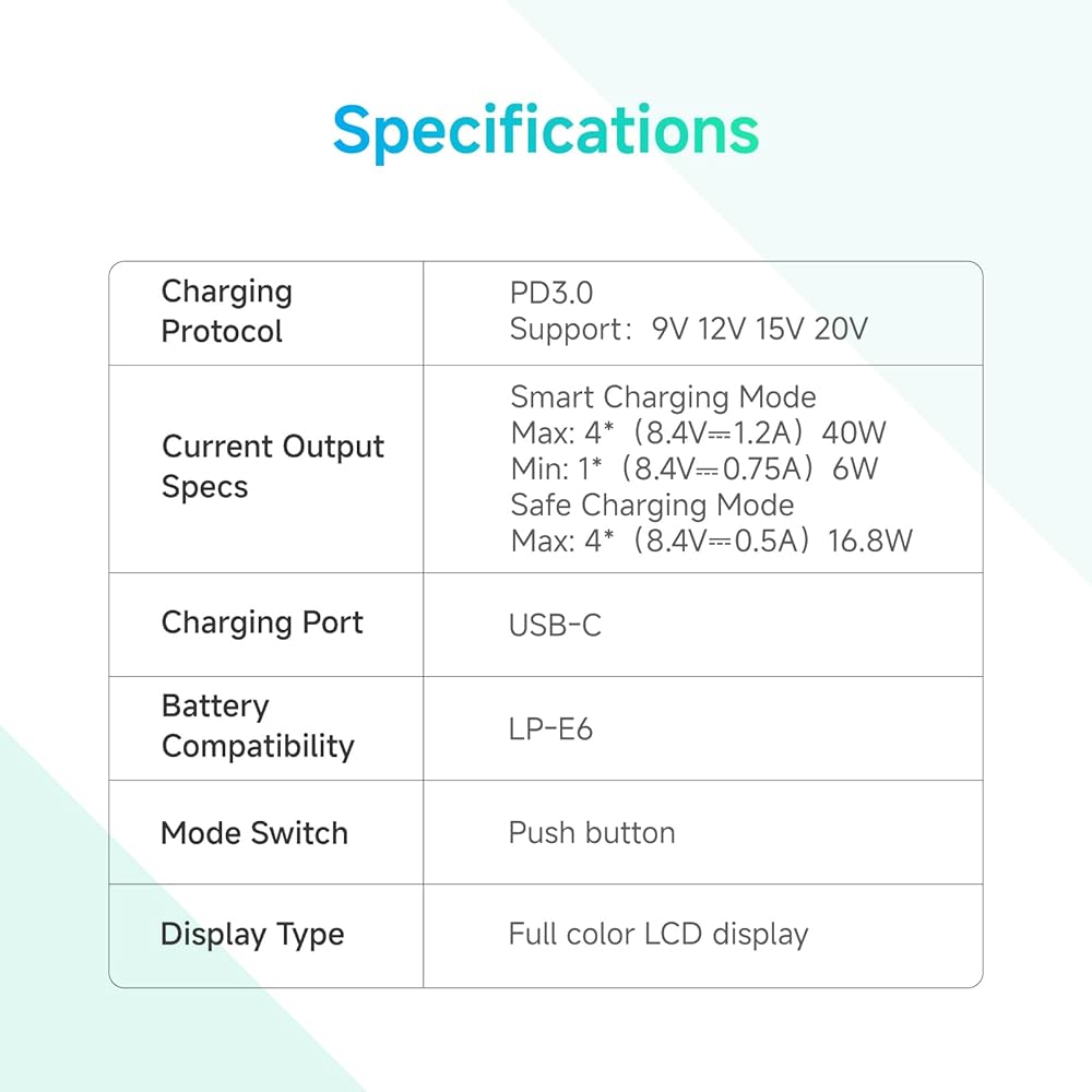 Two charging mode options: Smart Mode - Fast Charge with Excellent Efficiency, in this mode, the maximum power of each channel is 23W (8.4V⎓2.7A) and the minimum power is 6W (8.4V⎓0.75A). Safe Mode - Prolonging Battery Life with Trickle Charge, in this mode, the maximum power of each channel is 5W (8.4V⎓0.6A).