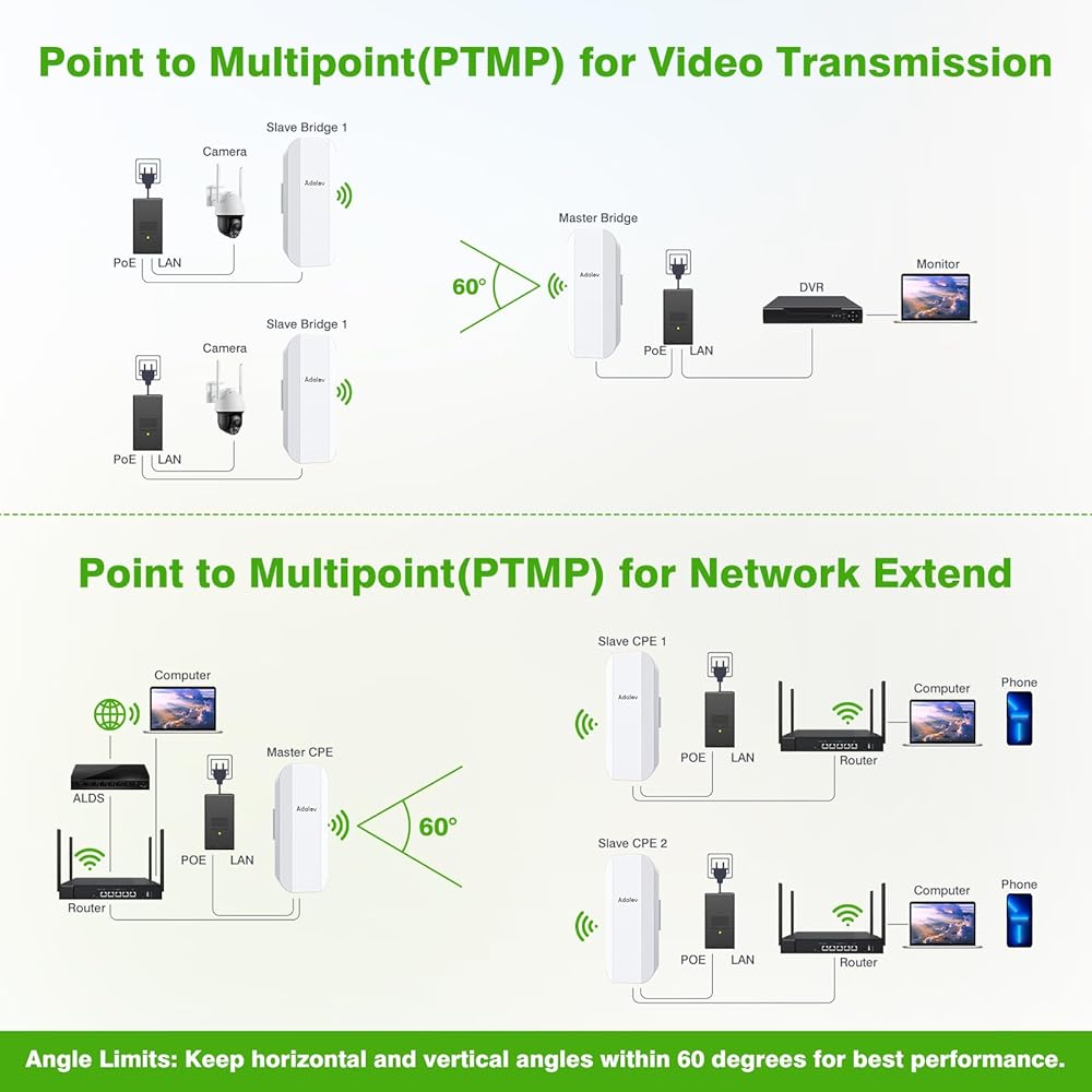 📽️【Plug and Play for PTP & PTMP Network Extend】CPE362 Wireless Bridge features automatic pairing and connection upon powering up. CPE362 wireless bridge connects two or more access points in a single direction.To achieve the CPE function, one needs to act as a transmitters and the other as a receiver.It is also great for extend network, video surveillance, and internet sharing for point to point or point to multipoint.